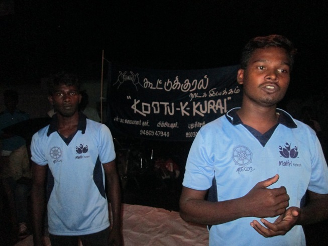 With the help of kootukural theatre Movement, by the presidency of Mrs.Manjula, ”kalyanakacheri” theatre was performed to focus the early marriages of females, in a village in Koodapakkam on 24th of November 2013 . In this theatre, the subject was made in order to; expose dowry violence, problems caused by drunkards in the society. The main aim of this theatre performance was to bring out Domestic violence problems, alcohol related problems into notice and to indicate that, the females were forced into early marriages, starting right from their childhood days onwards. Everyone appreciated after seeing the display done in these programs. They also applauded saying that, they really felt happy. The theatre group distributed notice, poster and handbills about the domestic violence. Songs were also sung. Theatres were outplayed in a good manner.Mr.Ambethkar organized this program and made this theatre to happen in Koodapakkam on a well note. Around 300 people from this village looked at this program.