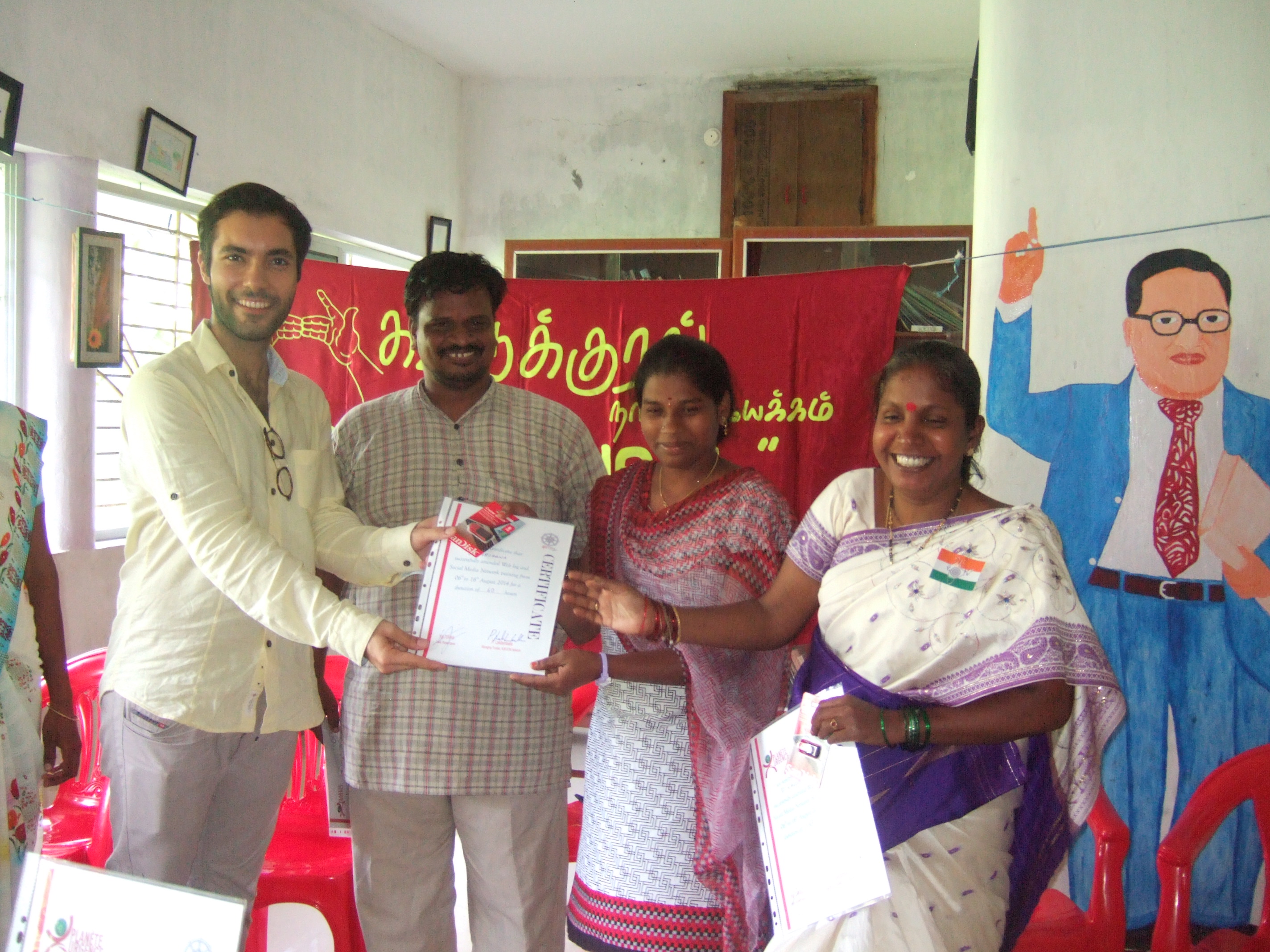 On August 15th, after two weeks, we all gathered at the Kotukkural office for the distribution of our certificates. It was the independence day of India and the committee talked about the freedom. Mr. Perumal stated that India got its freedom but the oppressed communities are still not free and there are lots of things to do: the freedom starts with knowledge and both teams -Kotukkural & ADECOM- do anything possible from skill training to internet classes to legal advice. Ms. Lalidamballe discussed the importance of blogs and social media networks. All students were happy when she informed that the knowledge she gained from Yigit will be transfered to the students in future classes. Mr. Yigit discussed the importance of storytelling and how it might be hard to change the past but the future can be reshaped. Everybody has a unique story and internet is a powerful tool to raise awareness about these stories. Mr. Anthony discussed the importance of MS. Office and skills for finding new jobs.