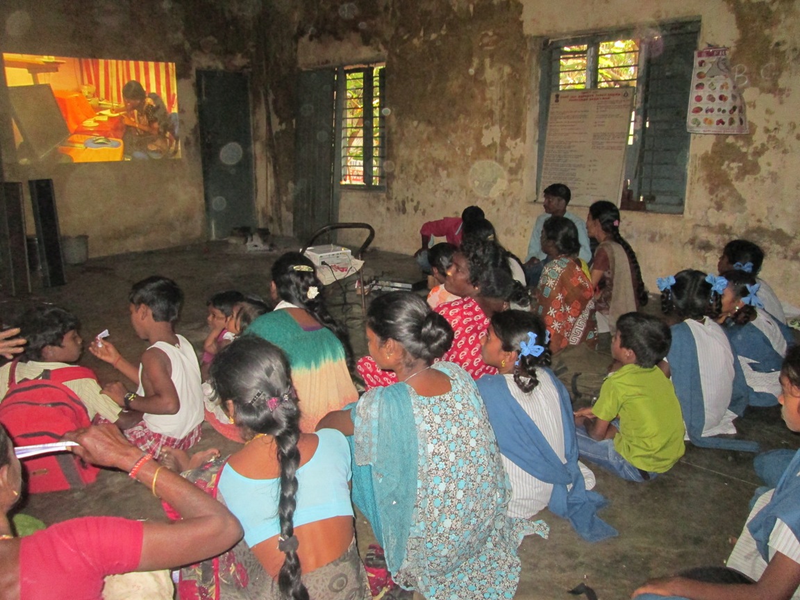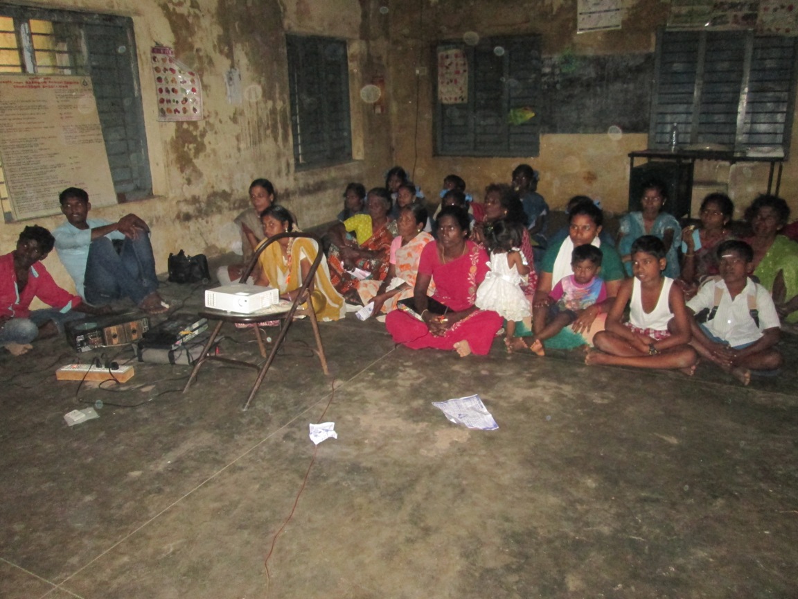 Film show was conducted on three days (03.12.2014, 04.12.2014 and 05.12.2014.) This film show was about domestic violence against women. The main purpose of programmed was create awareness about domestic violence against women. This show was conducted at three different villages, first village is Pichavarenpattu and second villages is sellipattu and third village is koodapakam People can easily understand any concept through video communication media than audio communication media. That’s why ADECOM choose such kind of innovative media to create awareness among rural people.