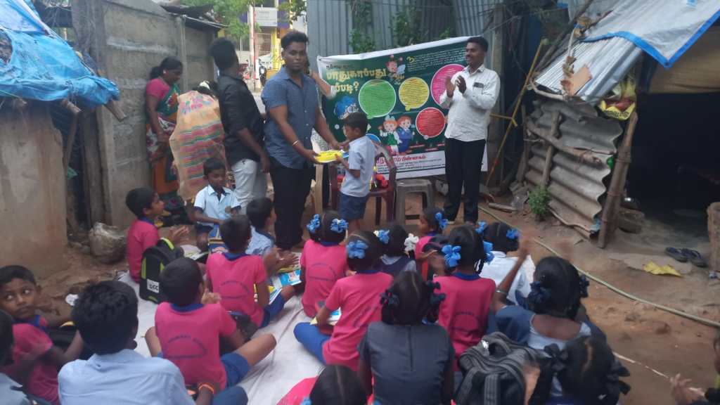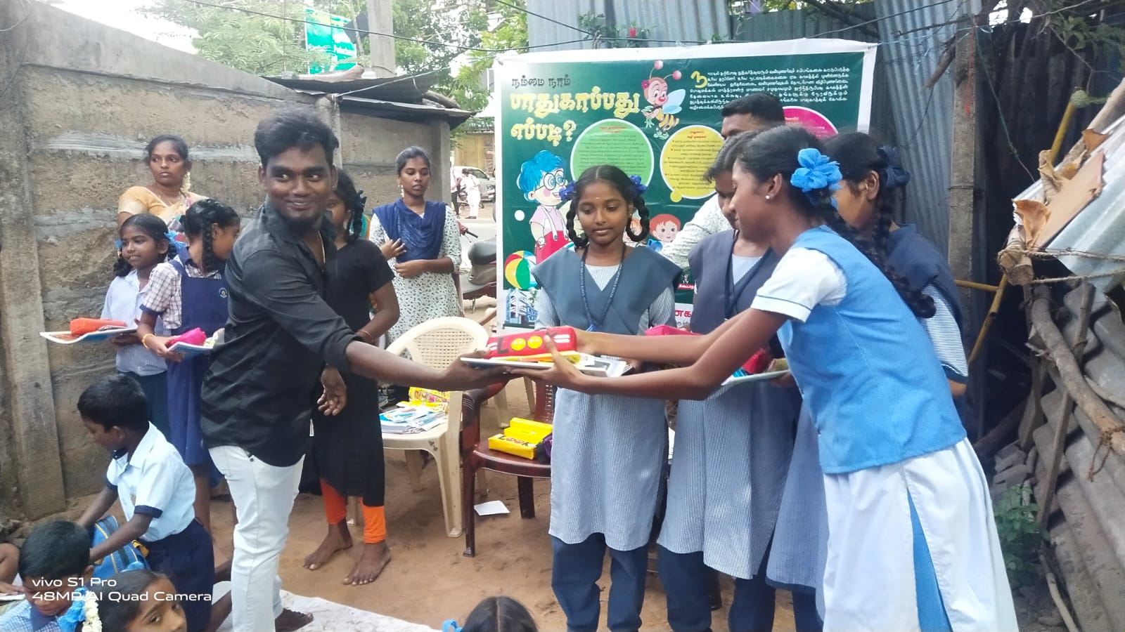 Welcomed Mrs. Padmavathy Family Counselor, explained the objectives of the event .Mrs. Vinodini Volunteer ,emphasized on important concepts like child safety and child line phone number to contact in case of problems. Mrs. Jamuna Rani, Night School Teacher Parents should play an important role in protecting children and making them leaders in the society. Mr. Raghu Salomon, a social activist, said that parents should become valuing their opinions and those who help us. Gestures by clapping hands such as clapping he taught through games . In this event Mr. Nirmal Babu Social activist distribute educational things to students . 30 children 12 women ,three youth were participated in this event.