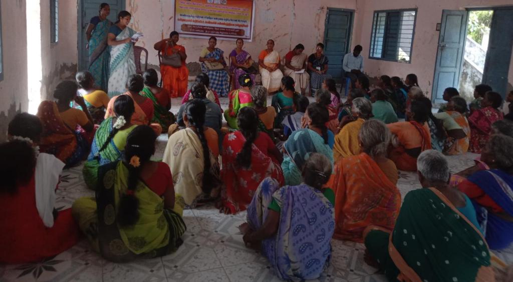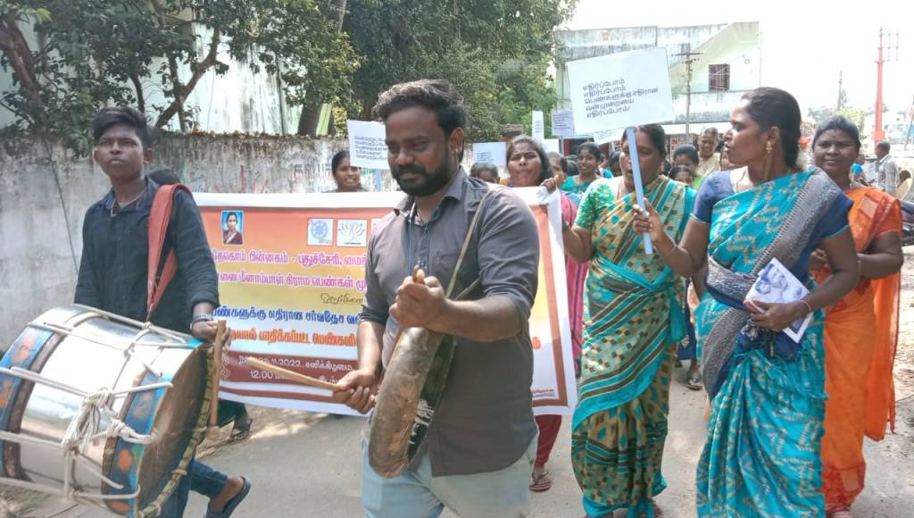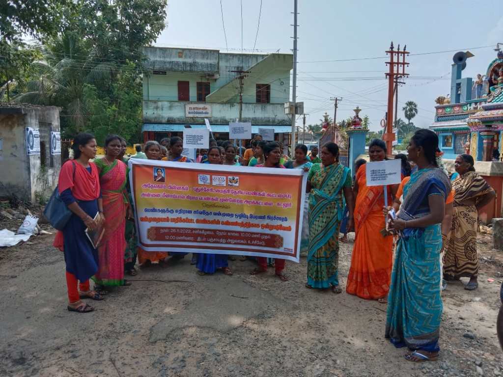 DAY – II, On 26.11.2022, Annai Meenambal village women development Trust organised the 16dayas campaign activism at Uchimedu village, Cuddalore district. More than 70 women participated in the Rally and took the pledge VAW. After the rally they organised the hall meeting to create awareness on Unite for the dignity of the survivors, Child marriage, domestic violence, public place harrasment, help line number. Also, they discussed on Constitution day.