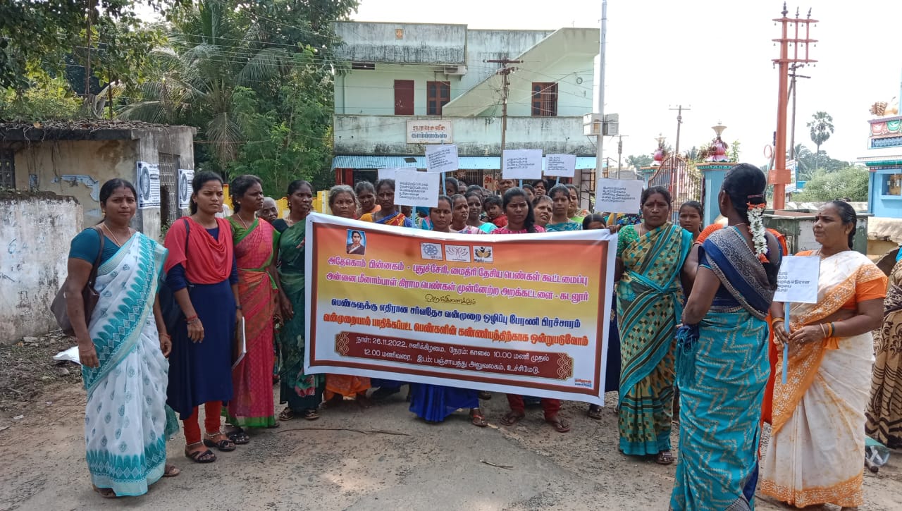DAY – II, On 26.11.2022, Annai Meenambal village women development Trust organised the 16dayas campaign activism at Uchimedu village, Cuddalore district. More than 70 women participated in the Rally and took the pledge VAW. After the rally they organised the hall meeting to create awareness on Unite for the dignity of the survivors, Child marriage, domestic violence, public place harrasment, help line number. Also, they discussed on Constitution day.