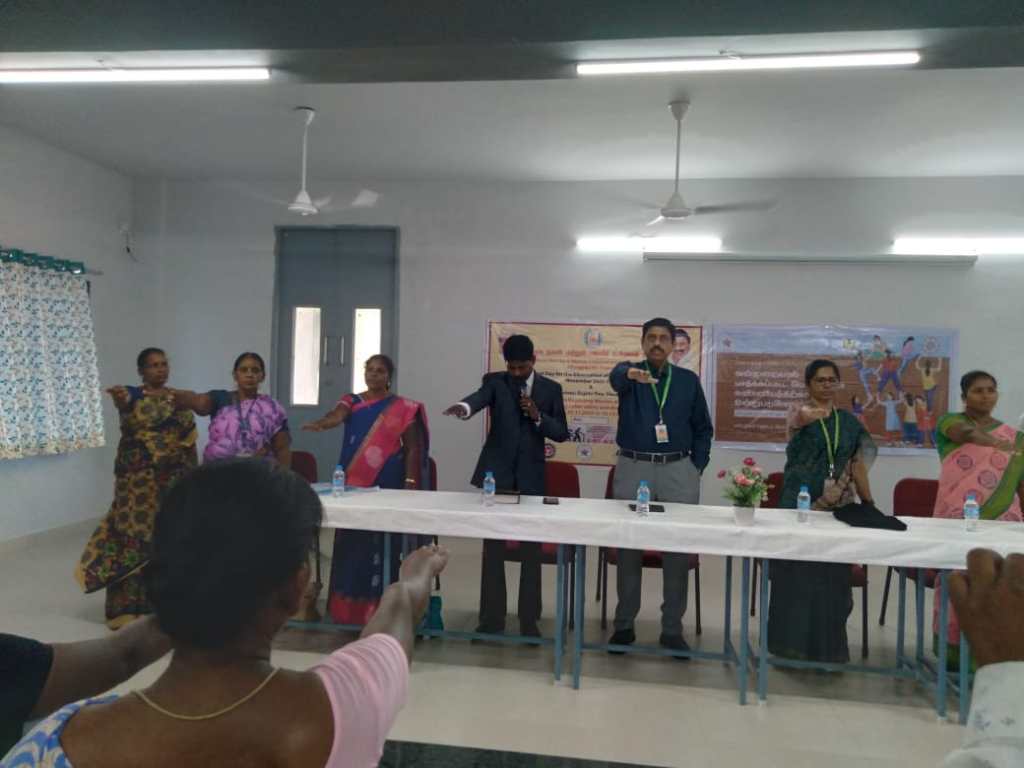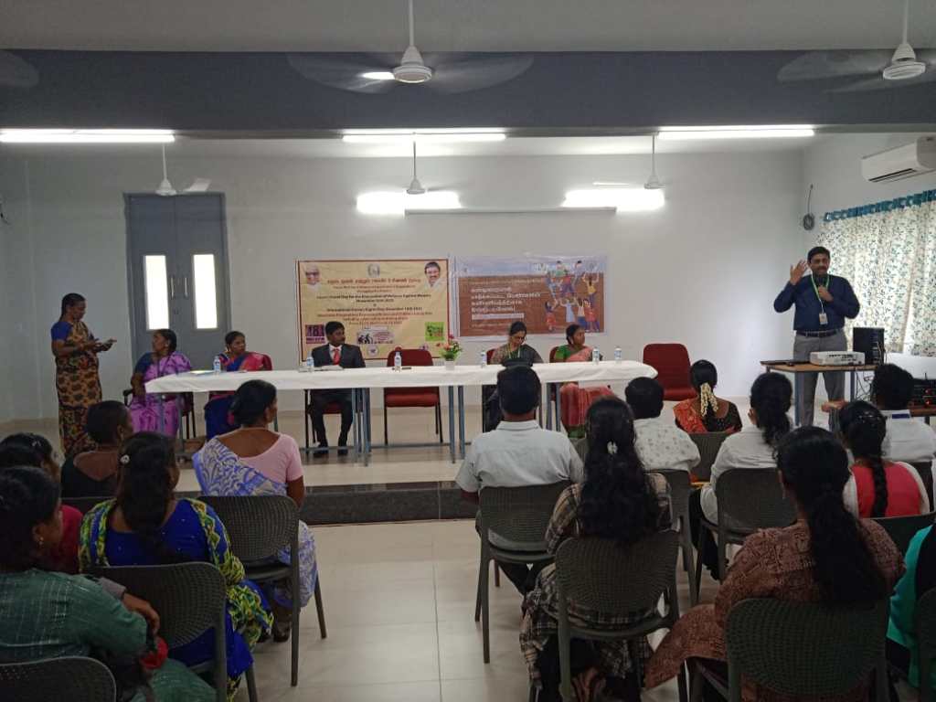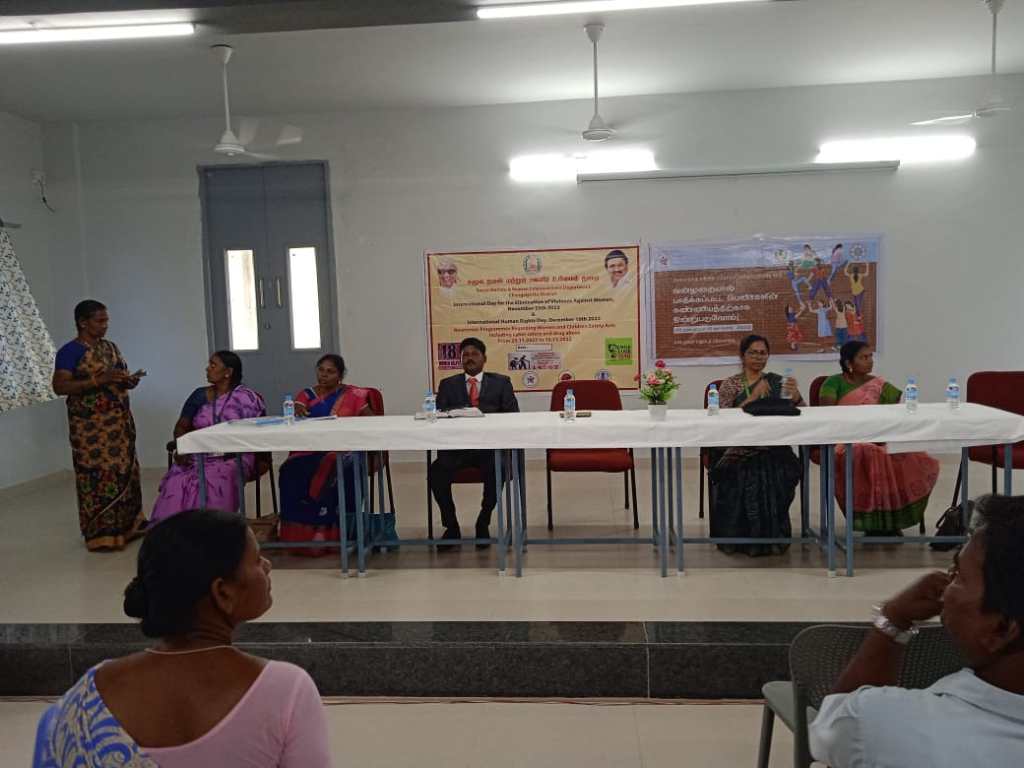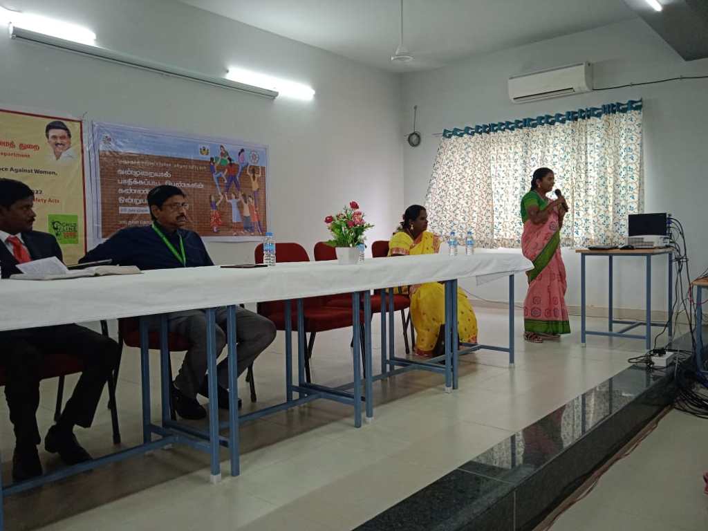 16 days Campaign- DAY – 4, On 28.11.2022, The department of social welfare, DWDS have coordinated the 16 days campaign activism in SRM college, Chengalpet district. It was to given knowledge to the participants regarding domestic violence, sexual violence, Child Marraige, child abuse, One stop center(OSC),Women helpline number 181 & children helpline number 1098, scheme available for women and child in Tamilnadu by Ms. Vedhanayagi, MS, Ms. Mageswari Project fellow, and our CBO Ms. Komala. Mr. Baskar, Advocate have highlighted the POCSO act and DV act. There are 150 people in total. (of these, 91 women, 59 men) Teacher’s – 9, Panchayat leader – 1, Ward member – 2, BDO – 2, CBO- 1, fellow – 1, Community women – 10, Students -124.