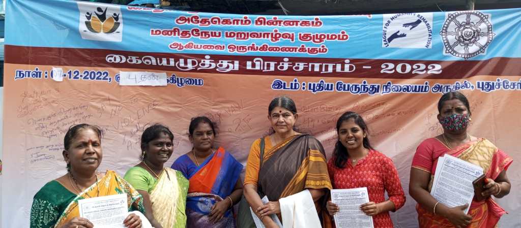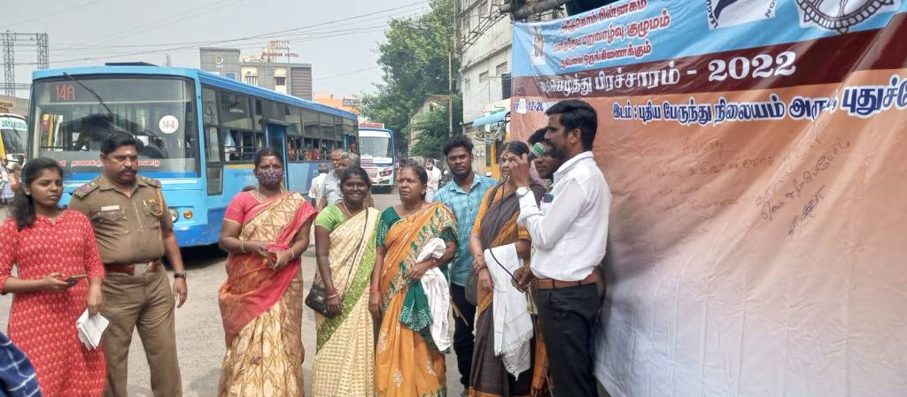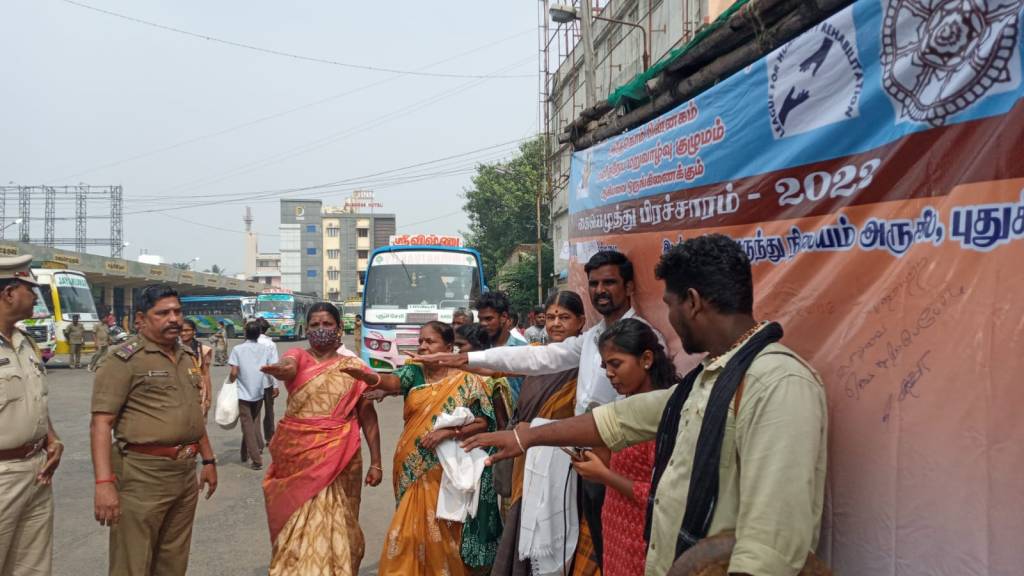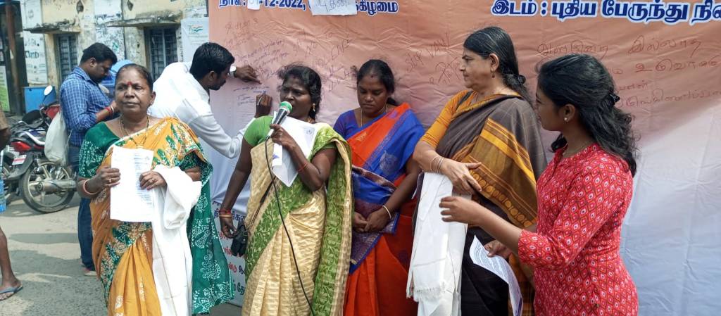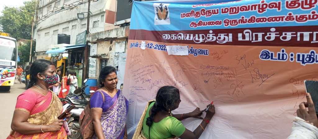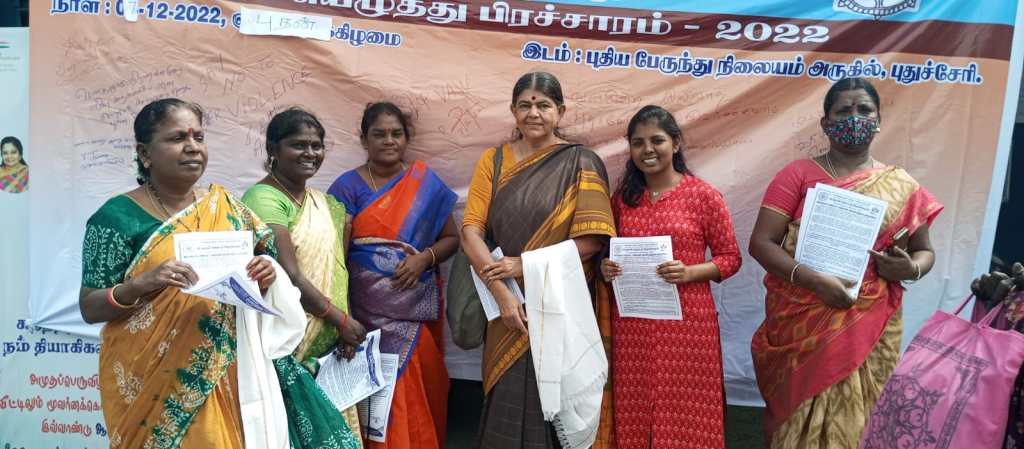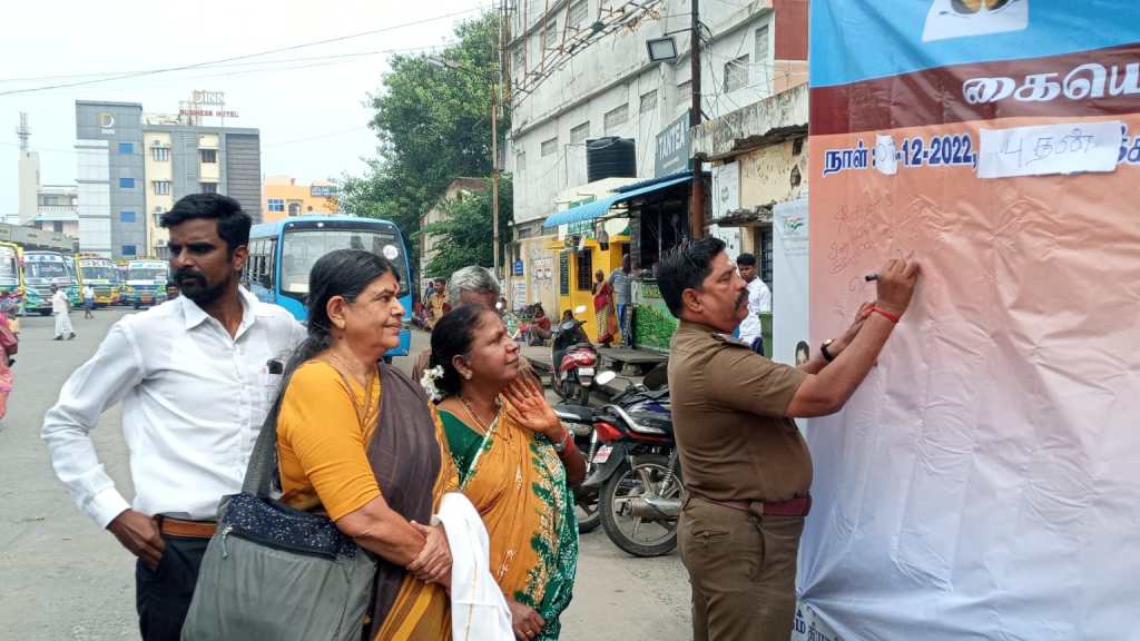 # 16 days Campaign- DAY – 13, On 07.12.2022, Our CBO Ms. Roselin Sheela has conducted the Signature Campaign at the Bus Stand, Pondicherry. It was inaugurated by Ms. Sudha Sunthar Raman, All India Vice President, All India Democratic Women’s Association (AIDWA). Initially, she has given a speech on stopping VAW. She started the campaign by signing the slogan “Let’s all come together to end violence against women”. Managing Trustee Ms, Lalidambbale signed “We will all come together to create Puducherry state without violence. Sub Inspector Mr. Chandrasekhar signed that, “the police will always support them in dealing with violence against women and children”. After that, students, drivers, social activists, local media and general public all signed that we will support to reduce violence against women. At the end of the campaign, everyone gathered together and took the pledge.