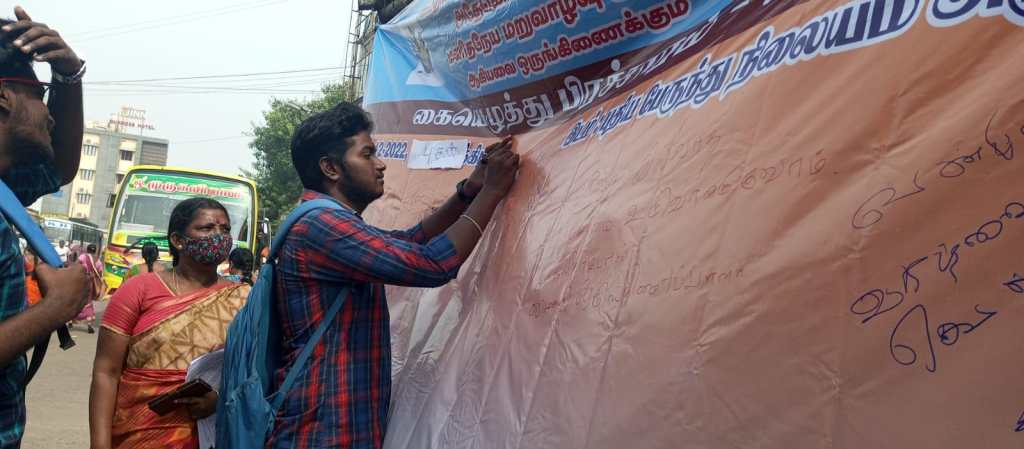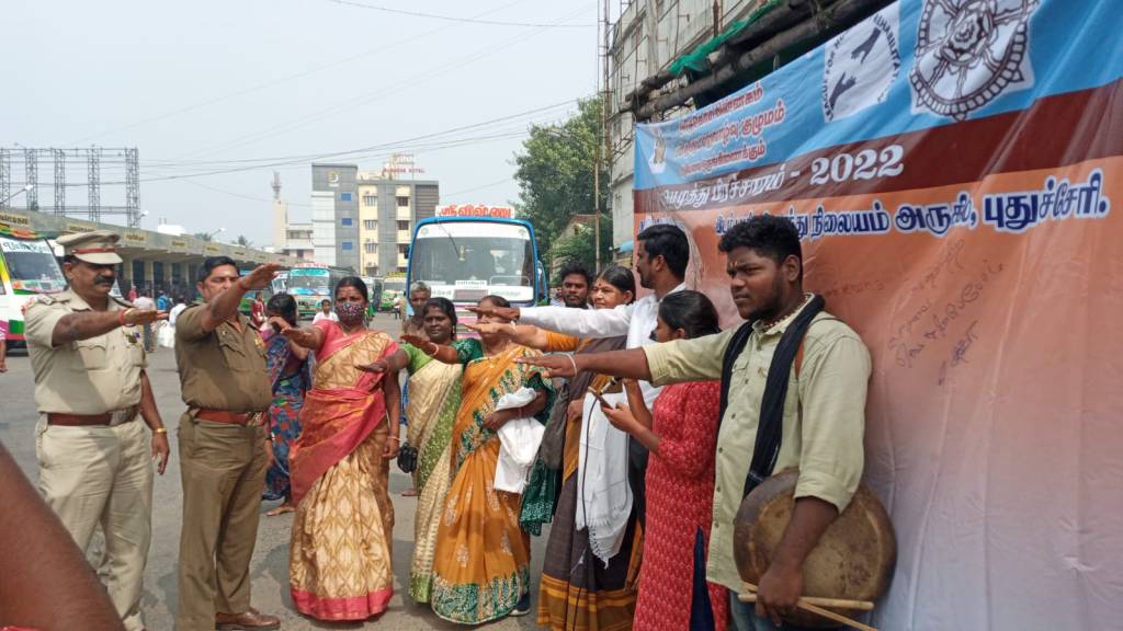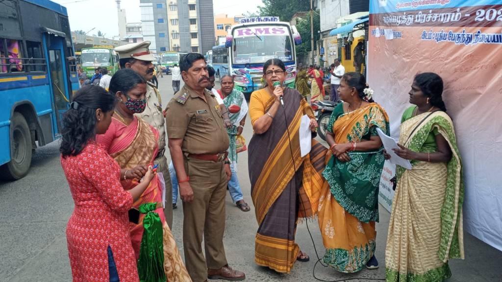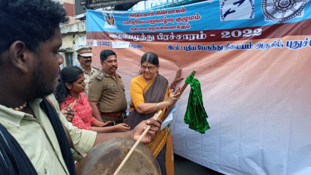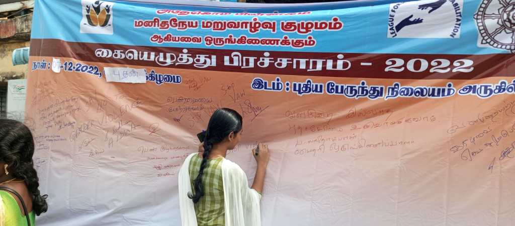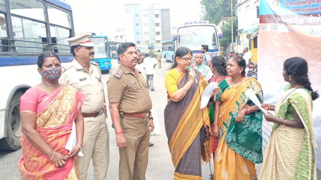 # 16 days Campaign- DAY – 13, On 07.12.2022, Our CBO Ms. Roselin Sheela has conducted the Signature Campaign at the Bus Stand, Pondicherry. It was inaugurated by Ms. Sudha Sunthar Raman, All India Vice President, All India Democratic Women’s Association (AIDWA). Initially, she has given a speech on stopping VAW. She started the campaign by signing the slogan “Let’s all come together to end violence against women”. Managing Trustee Ms, Lalidambbale signed “We will all come together to create Puducherry state without violence. Sub Inspector Mr. Chandrasekhar signed that, “the police will always support them in dealing with violence against women and children”. After that, students, drivers, social activists, local media and general public all signed that we will support to reduce violence against women. At the end of the campaign, everyone gathered together and took the pledge.