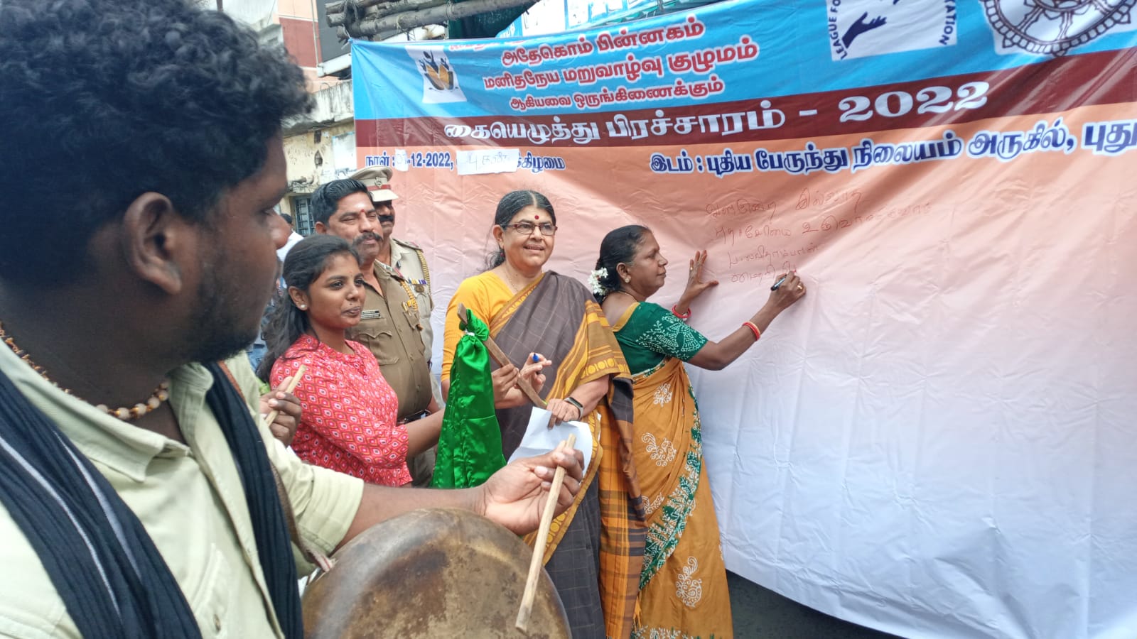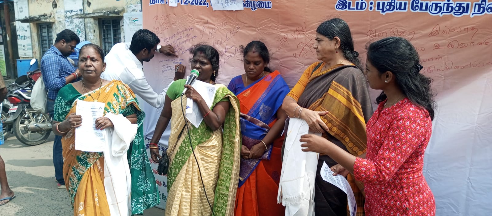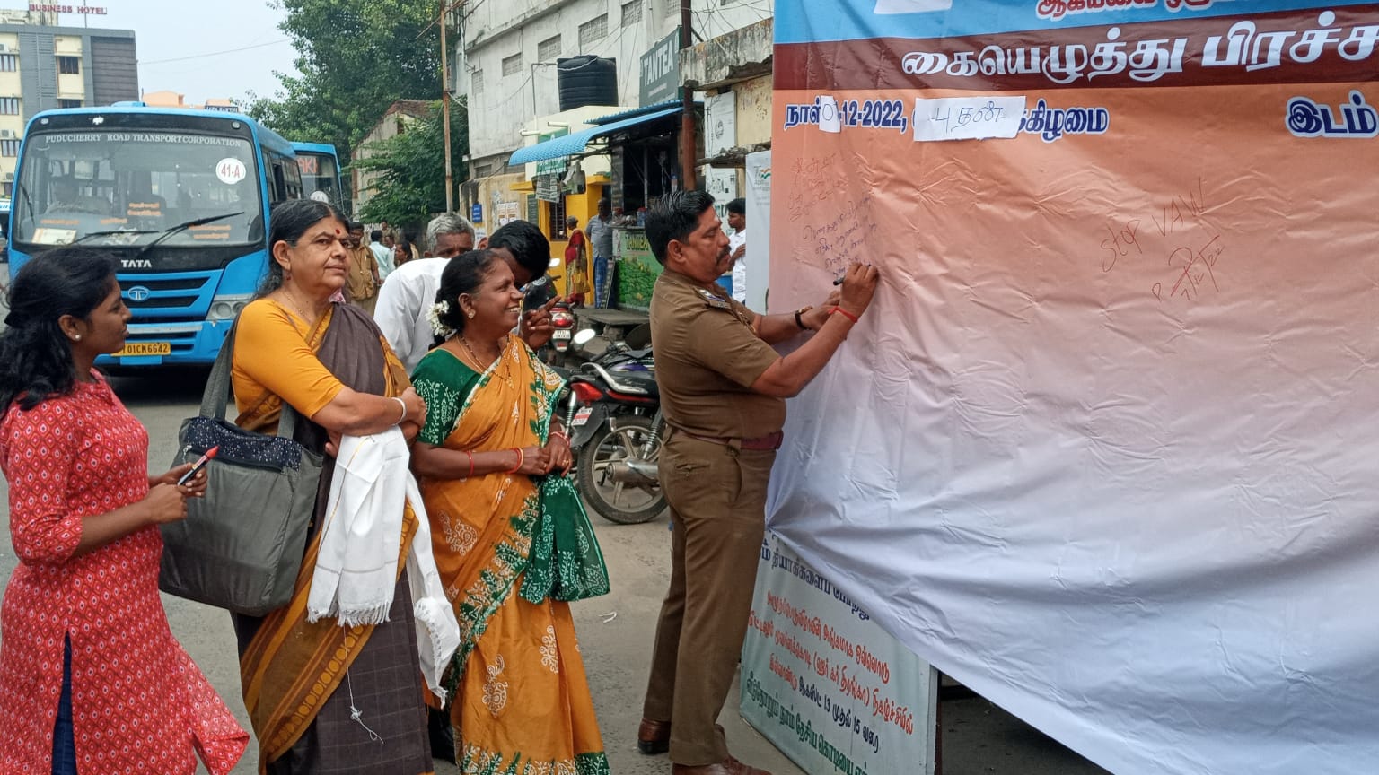 # 16 days Campaign- DAY – 13, On 07.12.2022, Our CBO Ms. Roselin Sheela has conducted the Signature Campaign at the Bus Stand, Pondicherry. It was inaugurated by Ms. Sudha Sunthar Raman, All India Vice President, All India Democratic Women’s Association (AIDWA). Initially, she has given a speech on stopping VAW. She started the campaign by signing the slogan “Let’s all come together to end violence against women”. Managing Trustee Ms, Lalidambbale signed “We will all come together to create Puducherry state without violence. Sub Inspector Mr. Chandrasekhar signed that, “the police will always support them in dealing with violence against women and children”. After that, students, drivers, social activists, local media and general public all signed that we will support to reduce violence against women. At the end of the campaign, everyone gathered together and took the pledge.