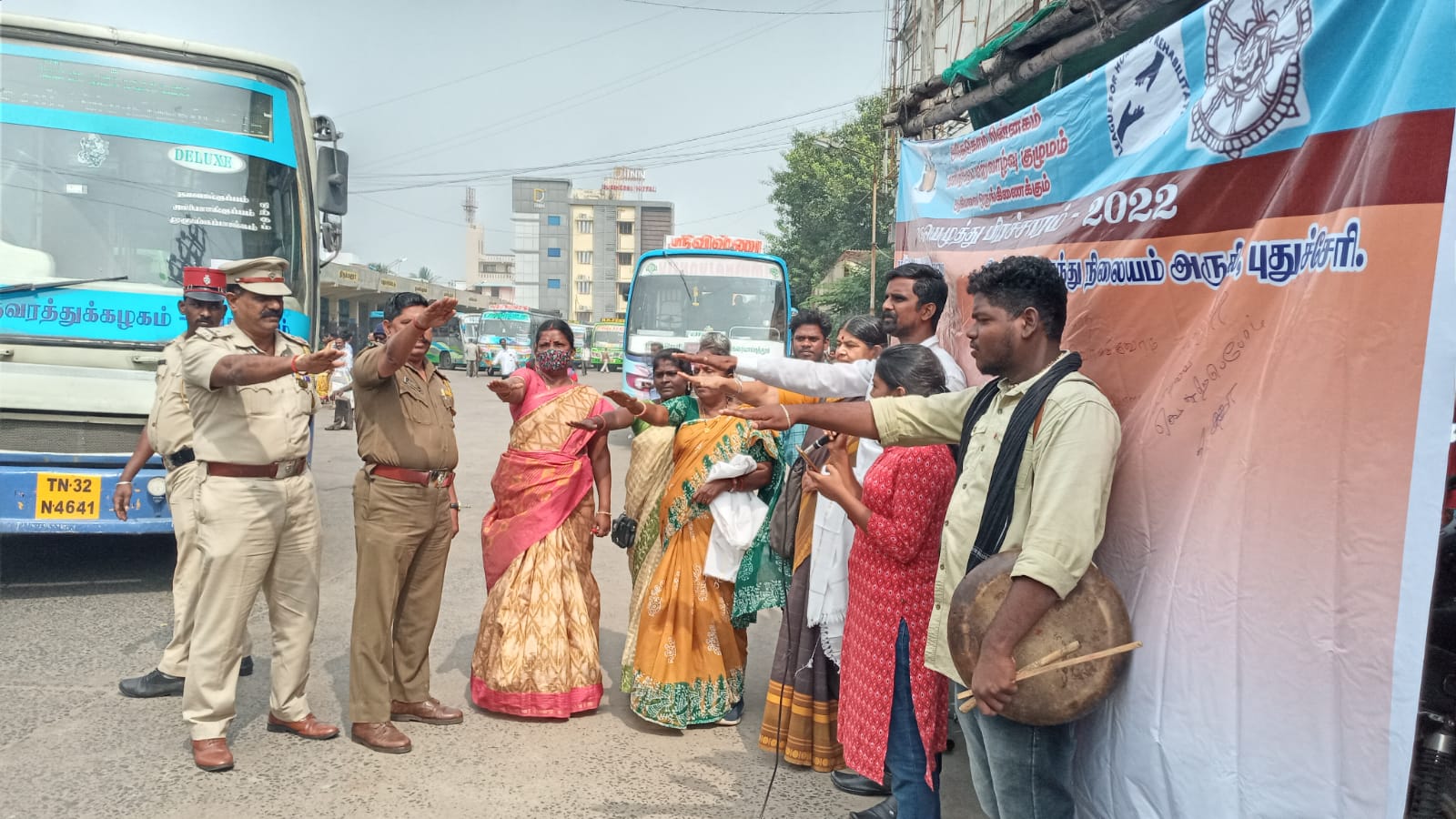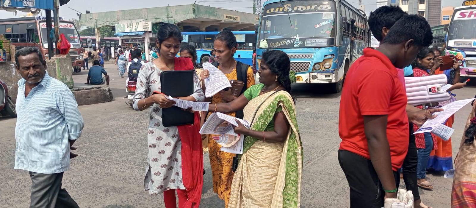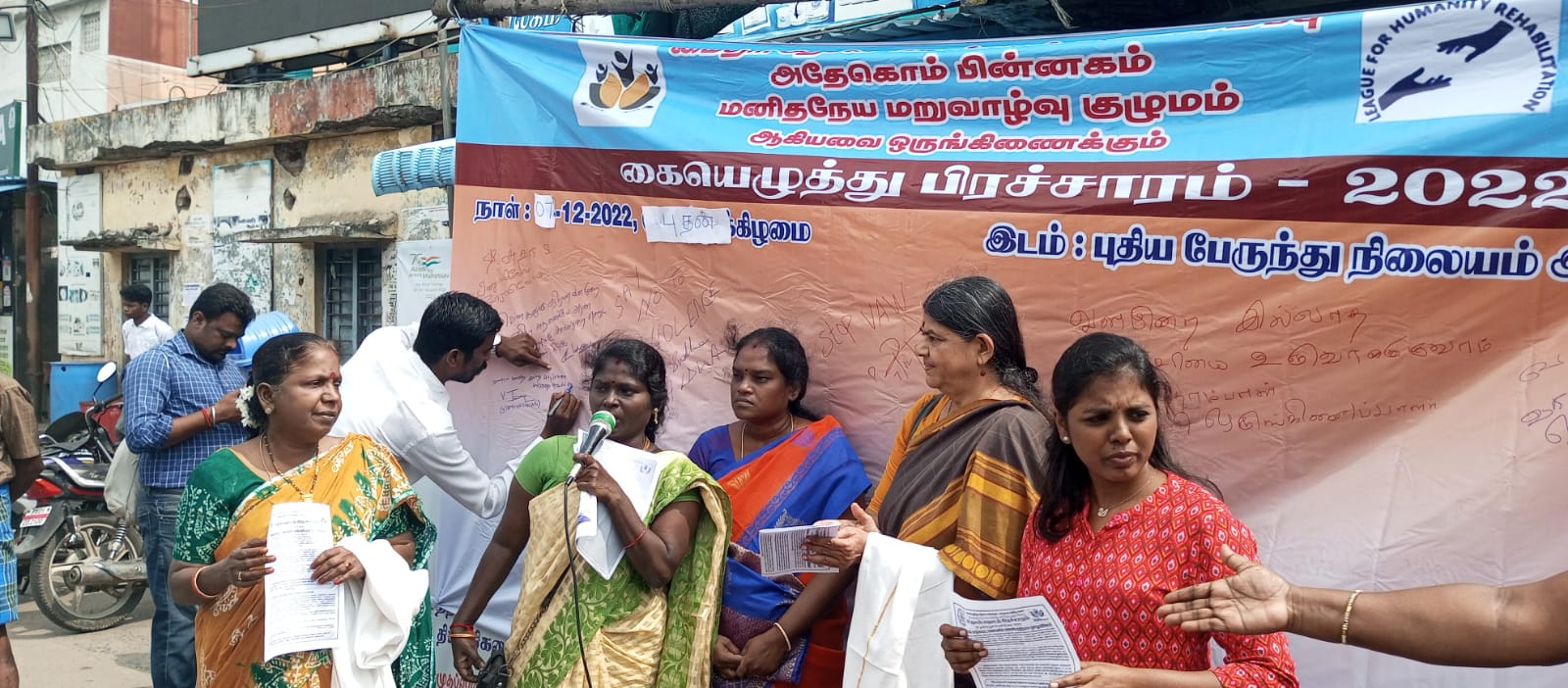 # 16 days Campaign- DAY – 13, On 07.12.2022, Our CBO Ms. Roselin Sheela has conducted the Signature Campaign at the Bus Stand, Pondicherry. It was inaugurated by Ms. Sudha Sunthar Raman, All India Vice President, All India Democratic Women’s Association (AIDWA). Initially, she has given a speech on stopping VAW. She started the campaign by signing the slogan “Let’s all come together to end violence against women”. Managing Trustee Ms, Lalidambbale signed “We will all come together to create Puducherry state without violence. Sub Inspector Mr. Chandrasekhar signed that, “the police will always support them in dealing with violence against women and children”. After that, students, drivers, social activists, local media and general public all signed that we will support to reduce violence against women. At the end of the campaign, everyone gathered together and took the pledge.