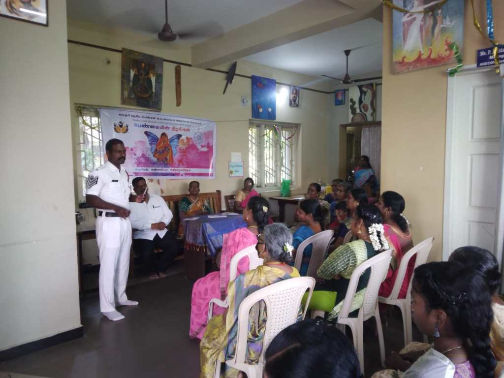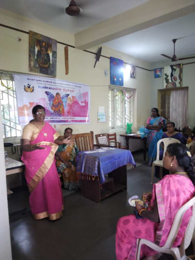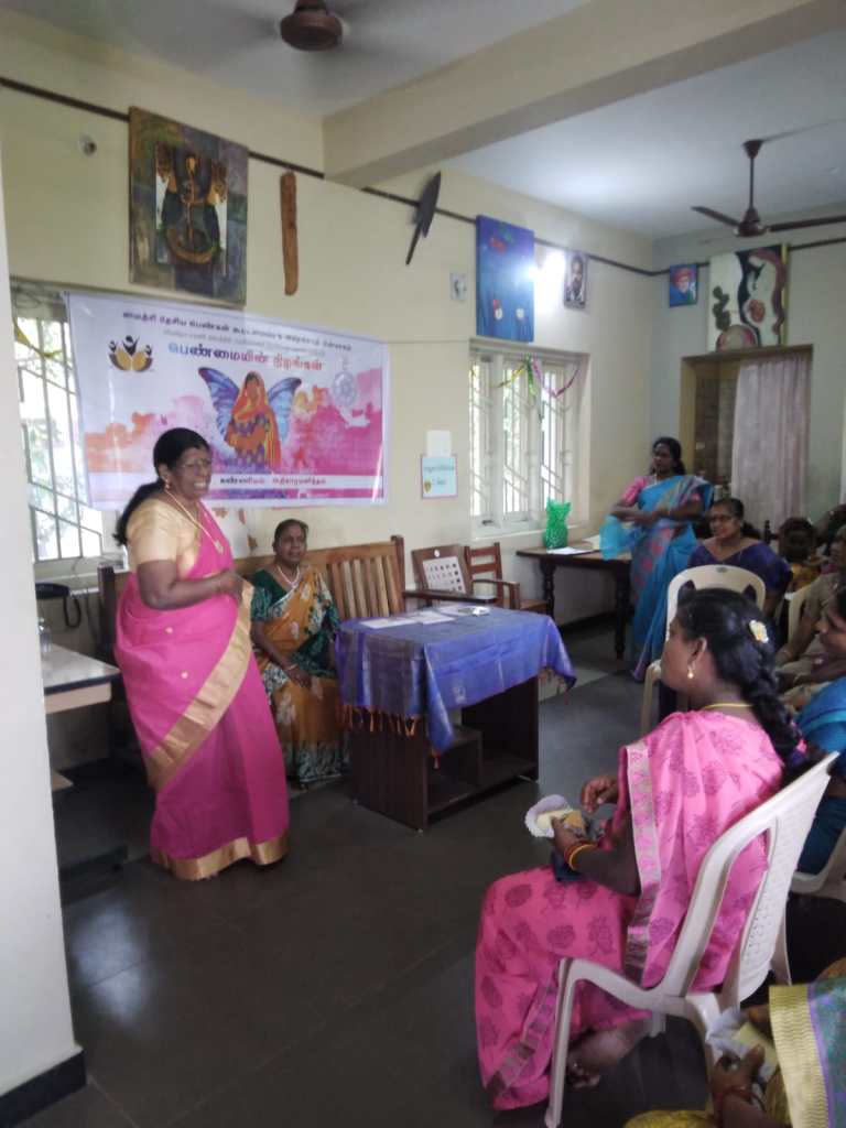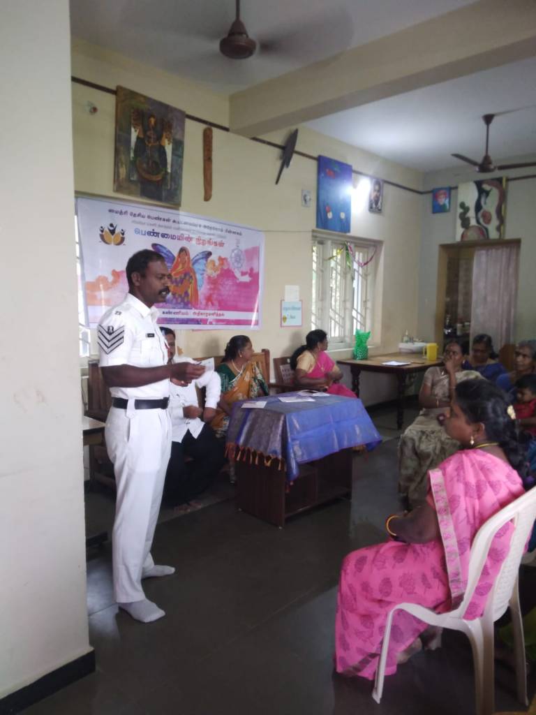வழக்குறிஞர் திரு . சீனு ,.பெருமாள் பேசுகையில் , பெண்கள் தங்களின் உரிமைக்காக சங்கங்களாக உருவாகவேண்டும். அப்போதுதான் உங்களுடைய பிரச்சனைகளை சரி செய்ய முடியும். மேலும், இன்று நம் தேவைகளை இன்டர்நெட் வழியாக பூர்த்தி செய்யும்போது சரியான முறையில் செய்யவேண்டும். எந்த சேவையை நாம் அங்கு சென்று நிறைவேற்றுவது, அதனால் ஏற்படும் தீமைகளை குழந்தைகளுக்கு எடுத்துக்கூறவேண்டும். ஆண் குழந்தைகளுக்கு பாலின சமத்துவத்தை வளர்க்கவேண்டும் என அவர் கேட்டுக்கொண்டார், சர்வதேச தங்கப் பதக்கம் வென்ற பெண்களுக்கான எளிய தற்காப்பு நிறுவனர் திரு .மோகன், பேசுகையில், தற்காப்பு கலை பெண்களுக்கு நல்ல பாதுகாப்பை வழங்குகிறது. தற்காப்பு கலை வழியாக பெண்கள் தங்களை உடல் ரீதியாக மனோரீதியாகவும் பாதுகாத்து கொள்ளமுடியம். தற்காப்பு கலைகளை பெண்குழந்தைகளுக்கு கற்று தரவேண்டும் என கூறினார்.