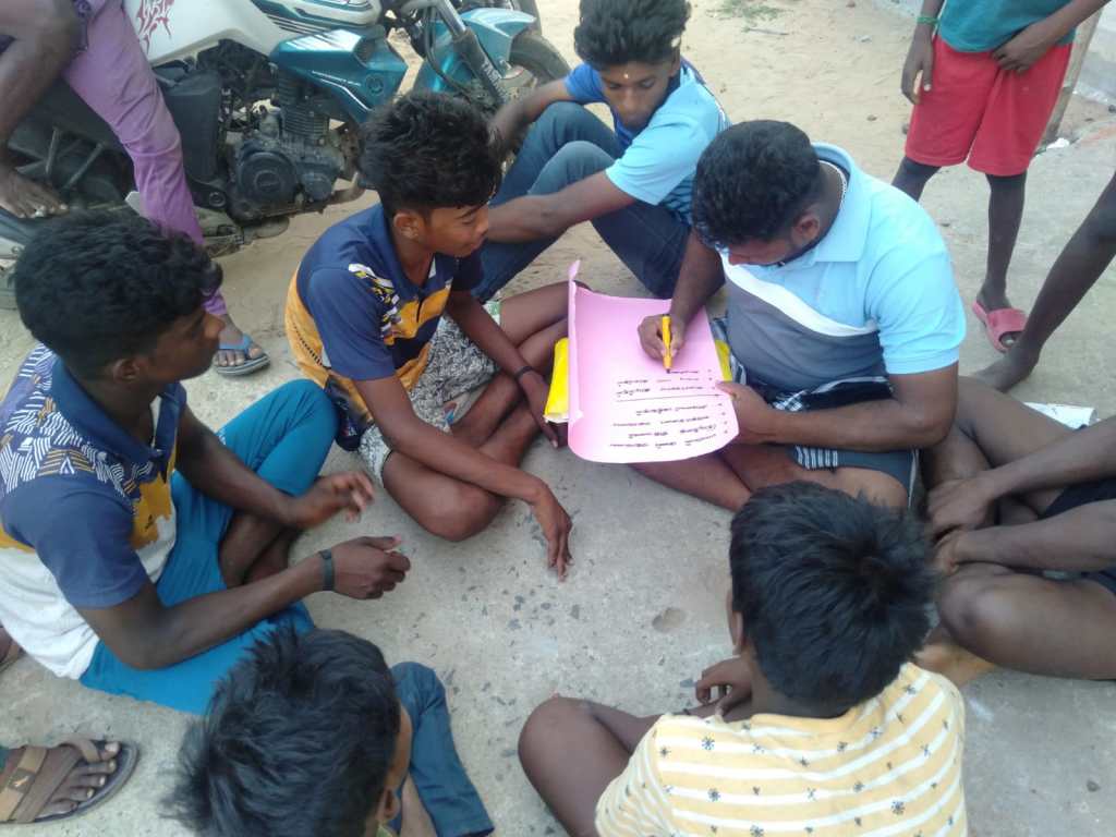 On 02.04.2023, the prospective building masculinity training was taken in Pakkam village, Villupuram district. The fellow took Session 8: Facilitation of Education and Education as a Right Session 9 Abusive language. Through a quiz and 2 different stories he explained the right to education and how it is denied to the girl child. Later he trained in Abusive language. In this he divided into 2 groups and asked them to write down and compile how men and women in this society speak using abusive words.Than, he summarized the whole session. There are 25 group members participating in the training.