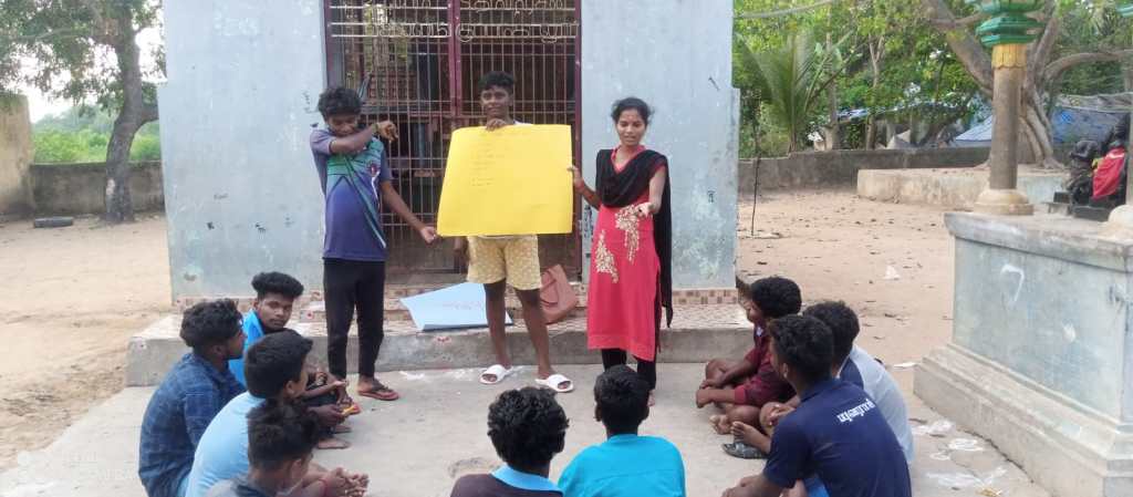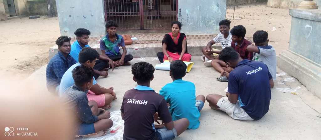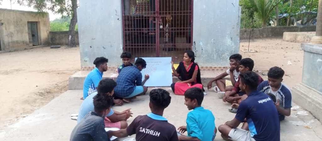 On 22.04.2023, our fellow organized perspective building on masculinity at Thookkanampakkam village, Cuddalore district. Previous sessions were reminded and feedback was shared by participants. Then, session 12, Self-harm was taken. What are the reasons for a person to self-harm? How do they harass? was asked. The group members answered. They came one by one and wrote their ideas on the chart. The young people each wrote down what caused them to torture themselves. They wrote in the chart that they are unable to control their anger, family problems, money fraud, failure in exams, unemployment, debt problems, love failure, marriage life going wrong, family burdens. Then it was asked how everything torments itself.Isolation, suicide attempts, drug addiction, tearing hands, not eating properly, tearing clothes, not talking to anyone, hating others, loss of job, lack of concentration in any activity, etc. others were given to explain what was written on the chart. Then, the fellow told them the missing information and concluded the session briefly.