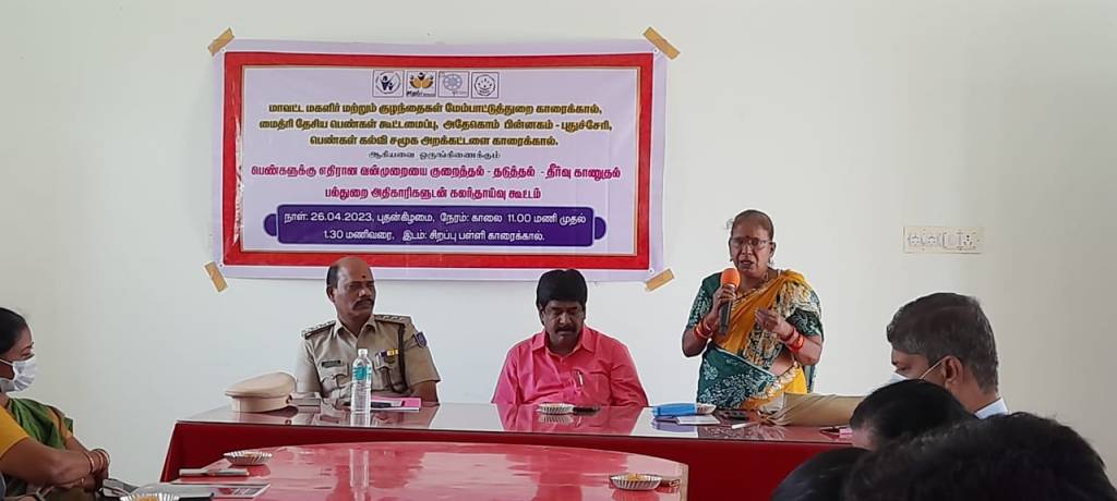 இக்கூட்டத்தில்வரவேற்புரை திருமிகு சுதா மாவட்ட ஒருங்கிணைப்பாளர் அதே கொம் பின்னகம் அவர்கள் நிகழ்ச்சியில் கலந்து கொண்ட அனைவரையும் வரவேற்றார் பின்பு இந்நிகழ்ச்சி நடைபெறுவதற்காக நோக்கம் சர்வேவர் என்ற சொல்லக்கூடிய வன்முறையால் பாதிக்கப்பட்ட பெண்களுக்கு விரைவில் நீதி கிடைப்பதற்கான பணிகளை மேற்கொள்ளுதல் எனவே நாங்கள் செங்கல்பட்டு மறைமலைநகர் எஸ்ஐ ஆர் டி என்ற இடத்தில் மாநில அளவில் 8 மாவட்டத்தையும் ஒருங்கிணைத்து கலந்தாய்வு கூட்டம் நடத்தியுள்ளோம். அக்கூட்டத்தில் 8 மாவட்டத்தில் இருந்து பெண்கள் மற்றும் குழந்தைகளுக்காக பணி செய்யும் அரசு அதிகாரிகள் கலந்து கொண்டனர் கூட்டத்தில் பாதிக்கப்பட்ட பெண்களுக்கு விரைவில் நீதி பெற்றுக் கொடுக்க என்ன சவால்கள் தடைகள் உள்ளது என்பதனை ஒவ்வொரு துறையினரும் பகிர்ந்து கொண்டனர் அதனை நாங்கள் கோரிக்கையாக தயார் செய்து ஒவ்வொரு துறையை சார்ந்த அரசு அதிகாரிகளிடம் வக்காலத்தாக வழங்கப்பட்டது அது நிறைவேற்றப்பட்ட கோரிக்கைகளையும் எடுத்து கூறினார்.
