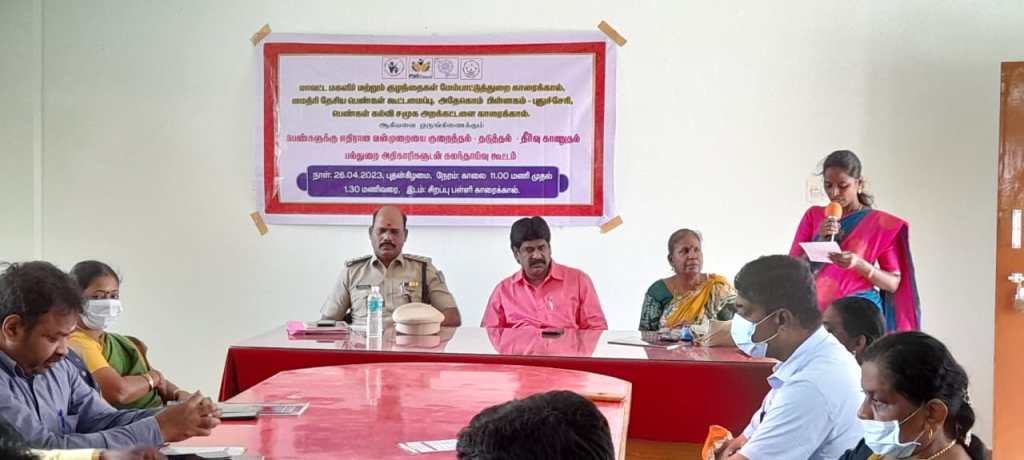 திரு ஜான்சன் டி சி ஆர் ( துணை மாவட்ட ஆட்சியர்) அவர்கள் பேசுகையில் வன்முறையை தடுக்க வேண்டும் தடுத்து பாதிக்கப்பட்ட பெண்களுக்கு என்ன செய்ய வேண்டும் என்று நாம் அனைவரும் ஆலோசிக்க வேண்டும் குழந்தைகள் படம் மூலம் விழிப்புணர்வை ஏற்படுத்தினால் எளிதில் புரிந்து கொள்வார்கள். அதற்கான செயல்பாடுகளை செய்ய வேண்டும். குழந்தைகளுக்கு பாதிப்பு ஏற்பட அதிகம் உறவுகள் தான் காரணம் உறவினர்களால் தான் குழந்தைகள் அதிகம் பாதிக்கப்படுகின்றனர். குழந்தைகளுக்கு பாலியல் கல்வி கற்றுக் கொடுக்க வேண்டும் என்றும் பெண்களுக்கு பாதுகாப்பு குறைவாக உள்ளது. அதனை மேம்படுத்துவதற்கான பணிகளை மேற்கொள்ள வேண்டிய தேவை உள்ளது என்றும் விளக்கினார்