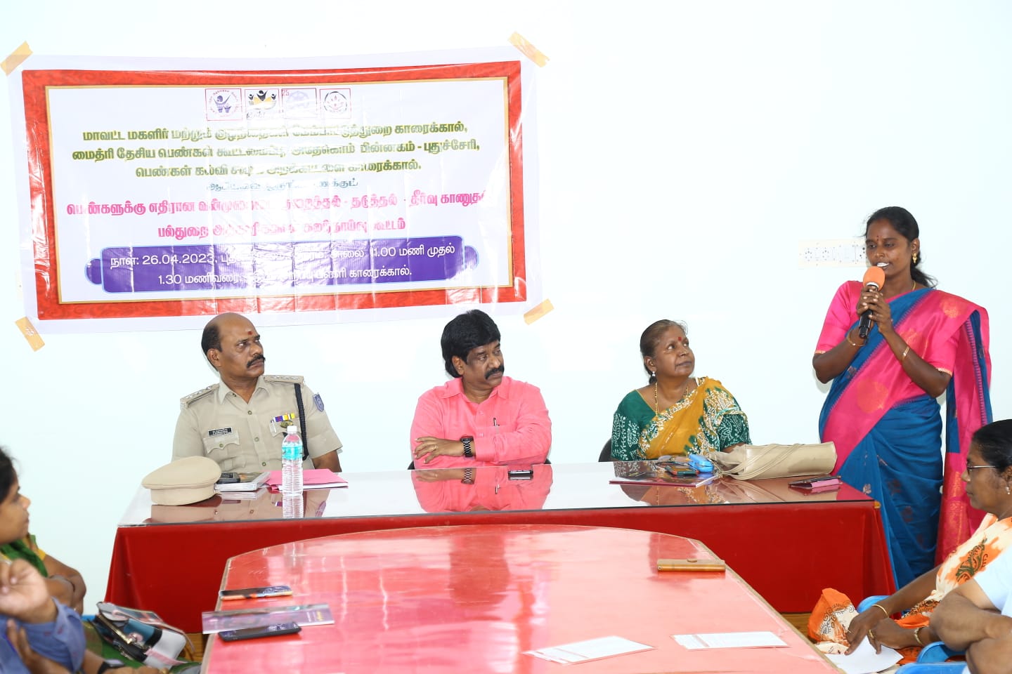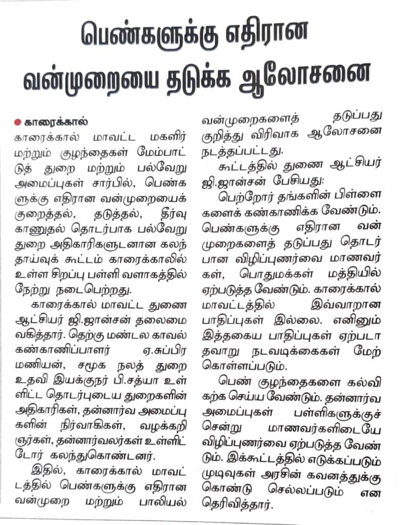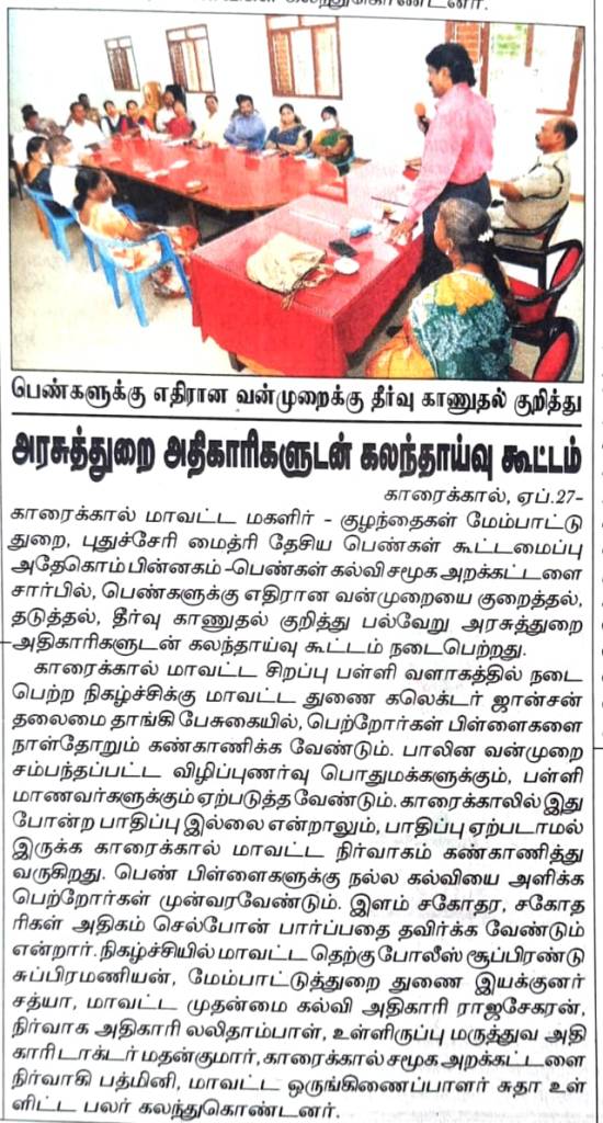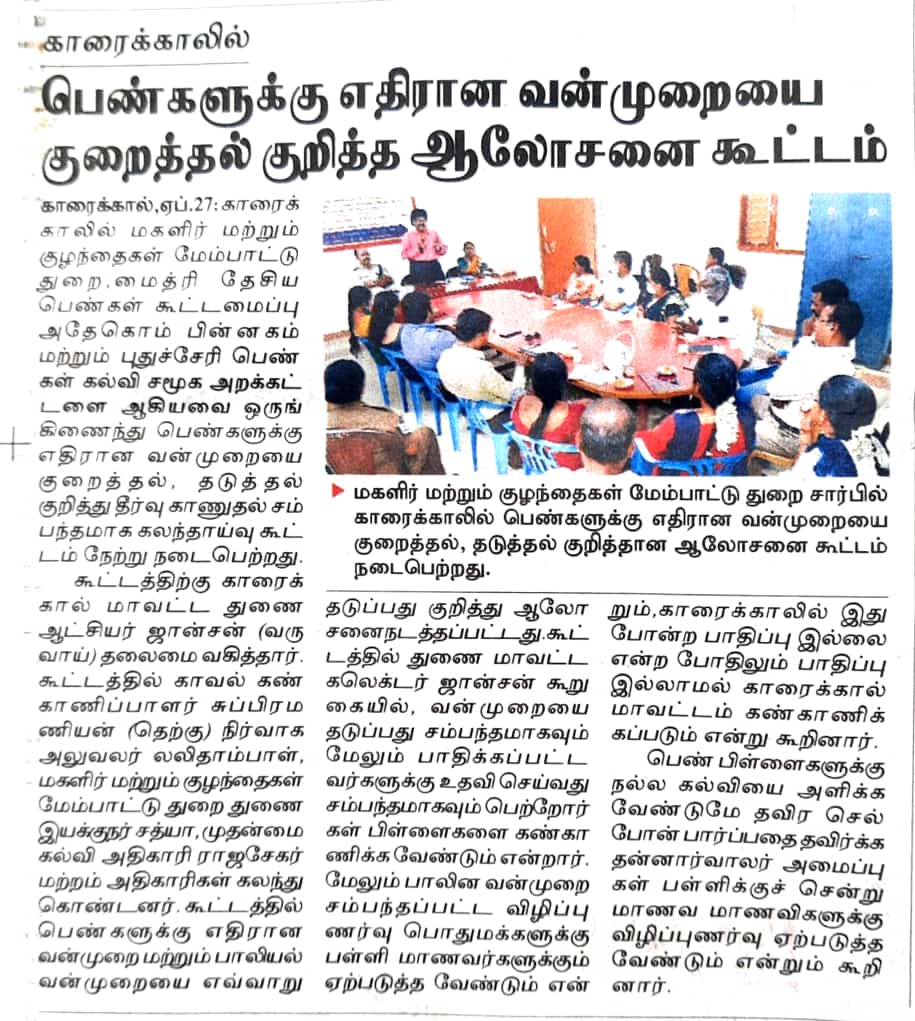 காரைக்கால் , 26-4-2024 அன்று காரைக்கால் மாவட்டத்தில் மாவட்ட மகளிர் மற்றும் குழந்தைகள் மேம்பாட்டு துறை மைத்திரி தேசிய பெண்கள் கூட்டமைப்பு அதற்கும் பின்னகம் புதுச்சேரி பெண்கள் கல்வி சமூக அறக்கட்டளை ஆகியவை ஒருங்கிணைந்து பெண்களுக்கு எதிரான வன்முறையை குறைத்தால் தடுத்தல் தீர்வு காணுதல் பல்துறை அதிகாரிகளுடன் கலந்தாய்வுக் கூட்டம் சிறப்பு பள்ளியில் நடைபெற்றது.
