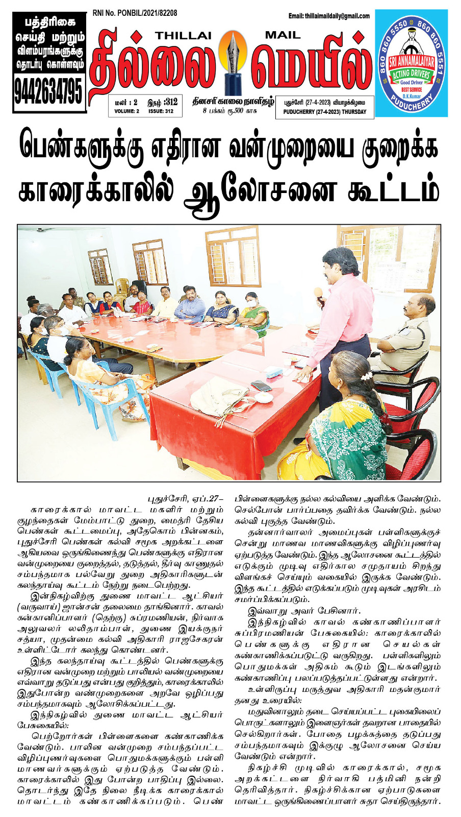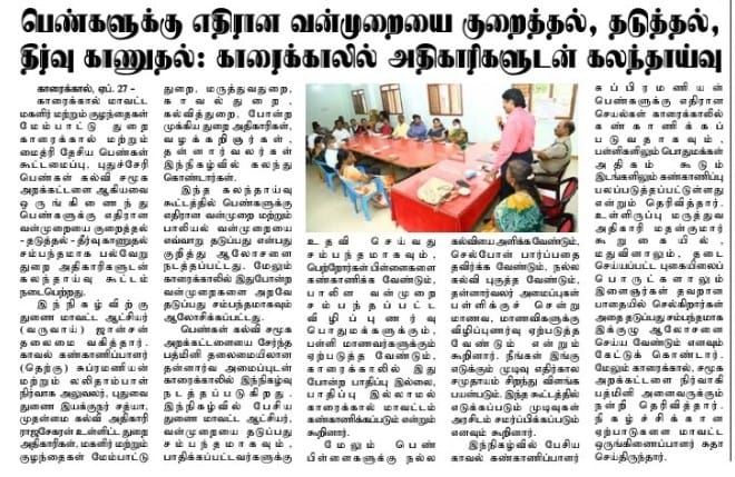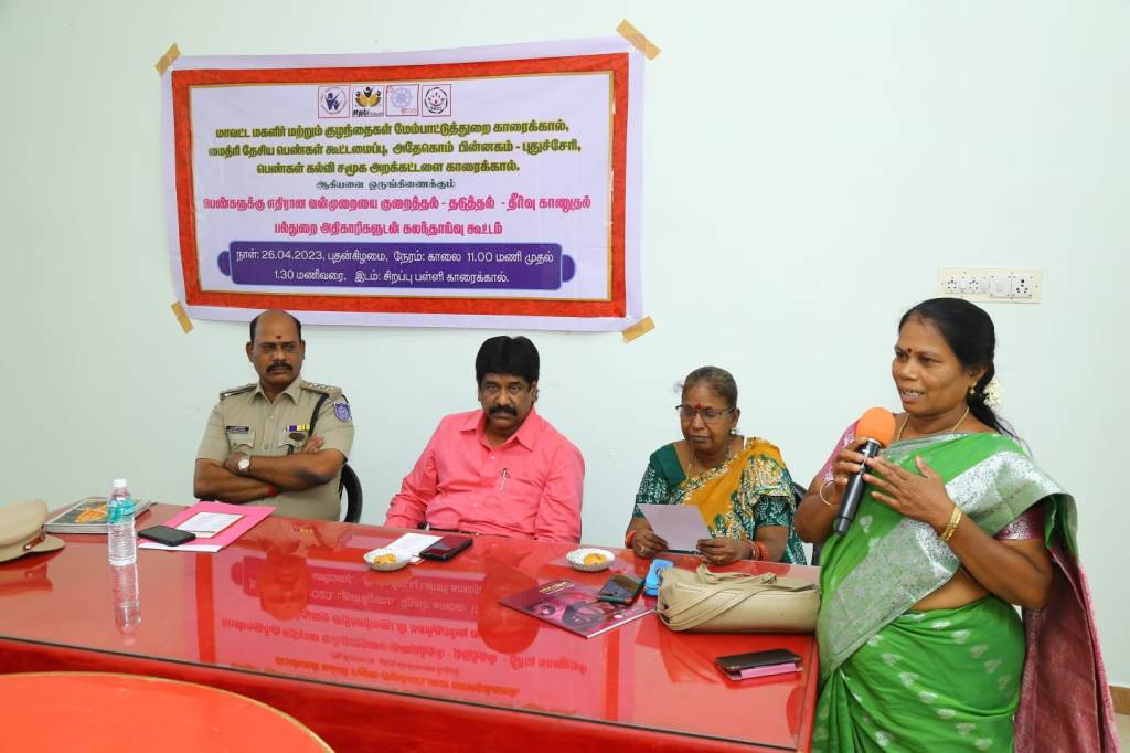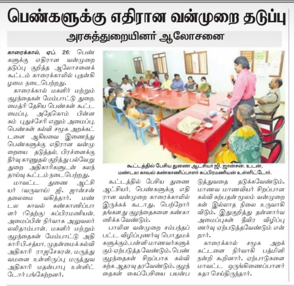 காரைக்கால் , 26-4-2024 அன்று காரைக்கால் மாவட்டத்தில் மாவட்ட மகளிர் மற்றும் குழந்தைகள் மேம்பாட்டு துறை மைத்திரி தேசிய பெண்கள் கூட்டமைப்பு அதற்கும் பின்னகம் புதுச்சேரி பெண்கள் கல்வி சமூக அறக்கட்டளை ஆகியவை ஒருங்கிணைந்து பெண்களுக்கு எதிரான வன்முறையை குறைத்தால் தடுத்தல் தீர்வு காணுதல் பல்துறை அதிகாரிகளுடன் கலந்தாய்வுக் கூட்டம் சிறப்பு பள்ளியில் நடைபெற்றது.