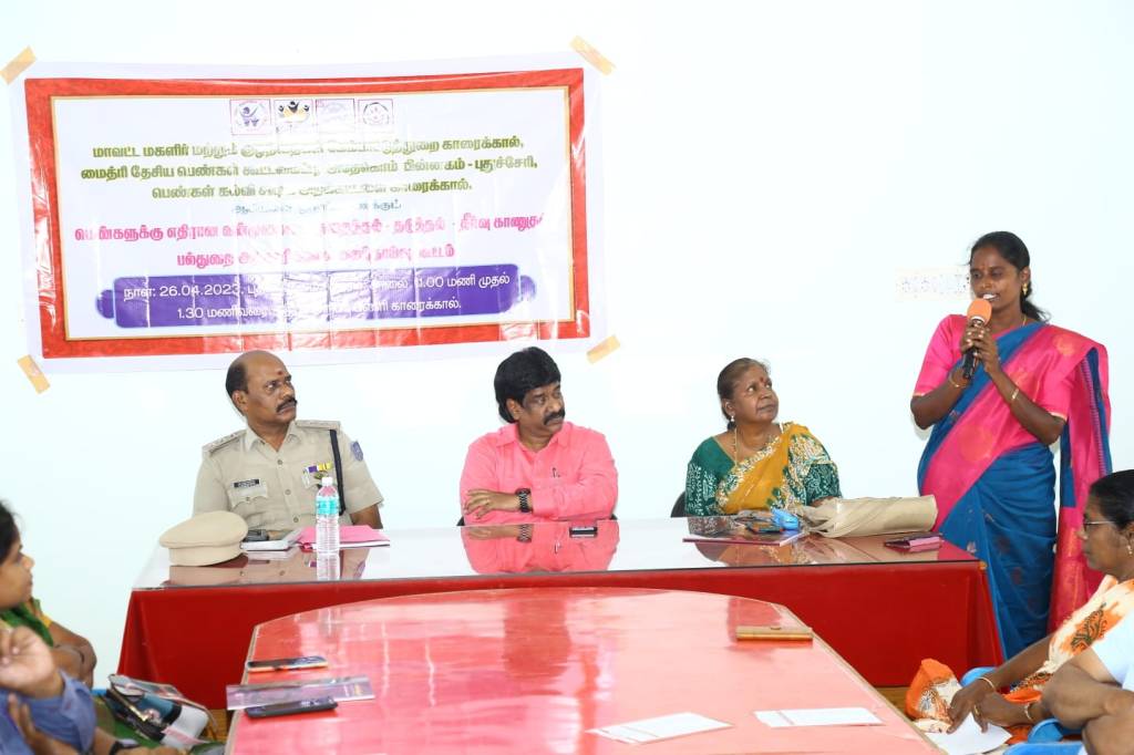 திரு ரவிசங்கர் பாதுகாப்பு அதிகாரி அவர்கள் பேசுகிறியில் அதே கோம் பின்னகம் சிறப்பான பணிகளை சில ஆண்டுகளாக காரைக்கால் மாவட்டத்தில் செய்து வருகின்றனர் அவர்களுக்கு முழு ஒத்துழைப்பினை வழங்குவதற்கு எங்கள் அலுவலகம் தயாராக உள்ளது என்றும் கூறி ஆண்களுக்கு விழிப்புணர்வை ஏற்படுத்த வேண்டும் 13 வயதில் உள்ள குழந்தைகளுக்கு ஆலோசனை வழங்க வேண்டும் மருத்துவ விழிப்புணர்வு ஏற்படுத்துவதன் மூலம் குற்றங்கள் குறைய வாய்ப்பு உள்ளது பெண்கள் அதிகம் பாதிக்கப்படுவதால் அவர்களால் தாங்க முடியாத நிலை ஏற்படும் பொழுது பெண்கள் வழக்கினை பதிவு செய்ய வருகின்றனர் அவர்களுக்கு முதலில் ஆலோசனை அவசியம் வழக்கு பதிவு செய்வது என்பது இரண்டாவது நிலை என்று விளக்கினார்