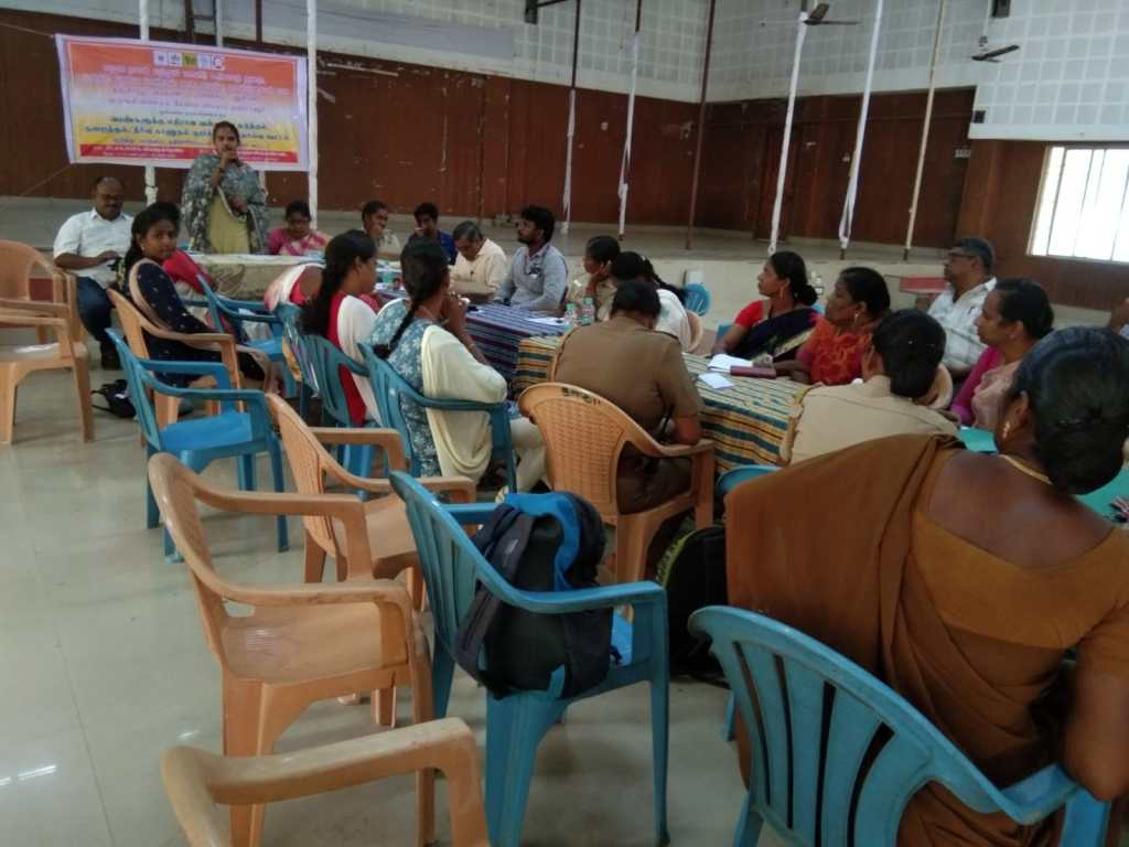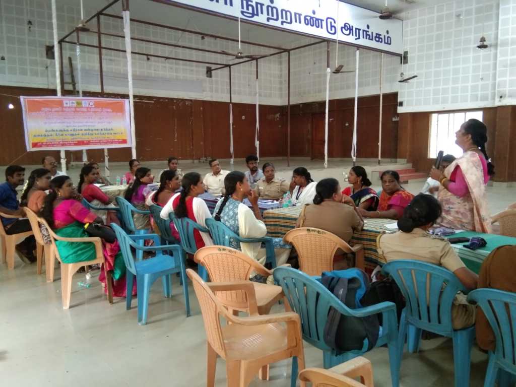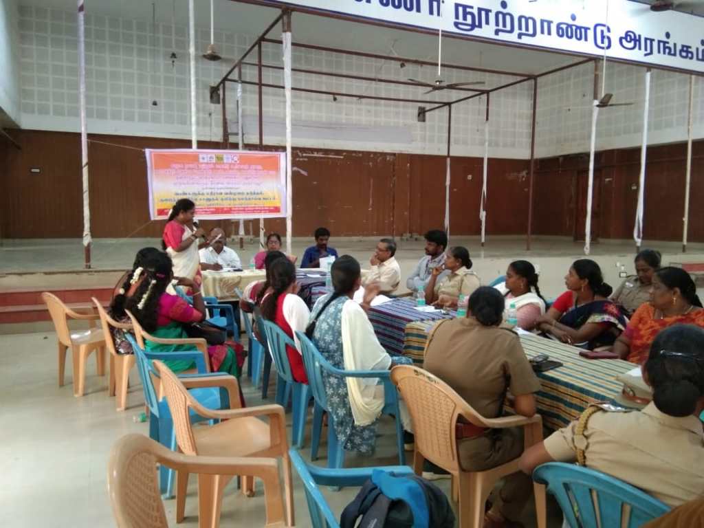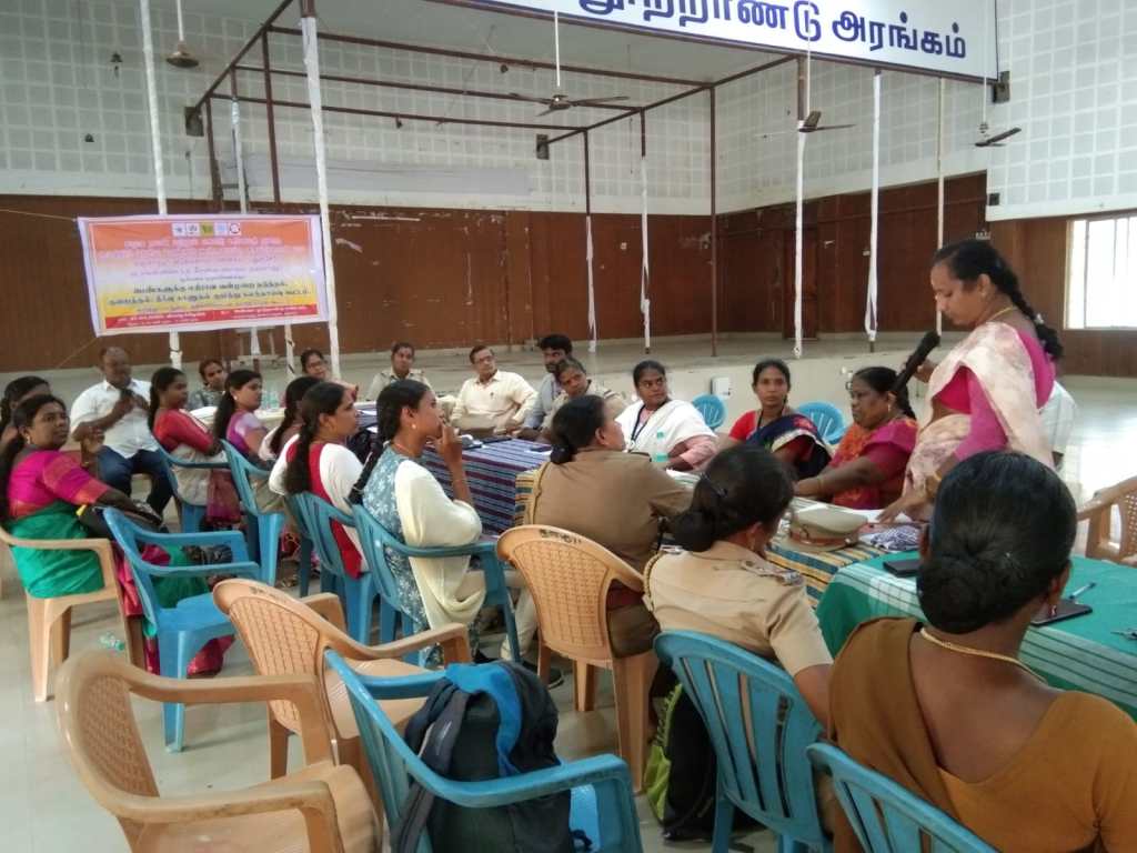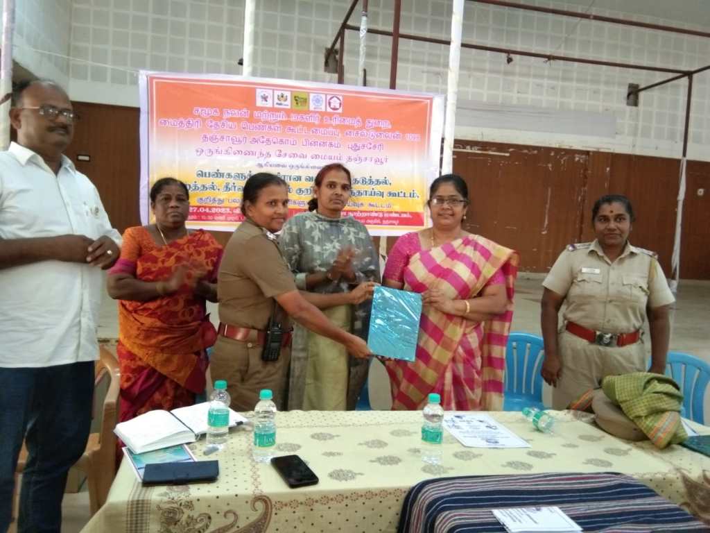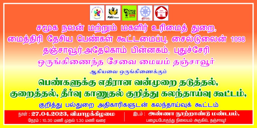 On 27.04.2023 Department of Social Welfare and Women’s Rights, One stop service center, Child Line, Maitri Network, and ADECOM Network jointly held a consultation meeting on Prevention, Reduction and redressal of Violence against Women at Anna Centenary Hall, Thanjavur.
