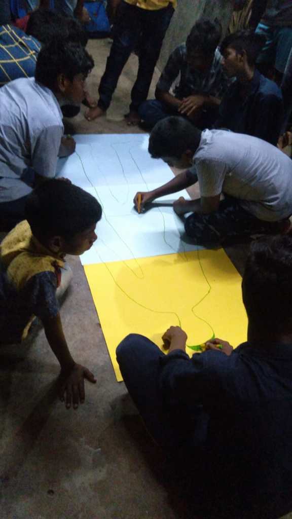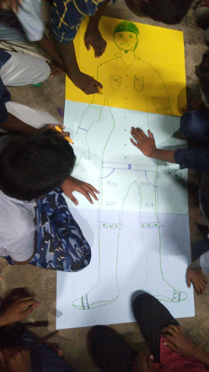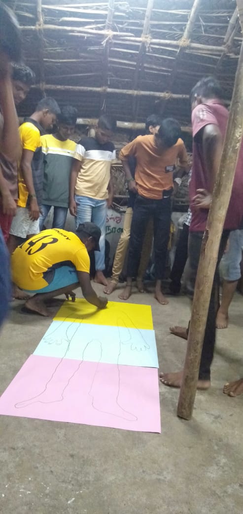 மாவட்ட ஒருங்கிணைப்பாளர் கூட்டத்தில் கலந்து கொண்ட இளைஞர்களை இரண்டு குழுக்களாக பிரித்தார். பின்பு அந்த குழுக்களிடம் உருவப்படம் வரைந்து அதில் ஆணின் அடையாளங்களை வரைந்து எங்களுக்கு விளக்க வேண்டும் என்று கூறினார். அதற்கு 20 நிமிடம் வழங்கப்பட்டது. இளைஞர்கள் சார்ட் பயன்படுத்தி அதில் ஒரு இளைஞரை படுக்க வைத்து படம் வரைந்தனர் பின்பு அதில் ஆண் என்பதற்கான அனைத்து அடையாளங்களையும் வரைந்து அதன் விவரங்களை இளைஞர்கள் விலகினார். பிறகு இளைஞர்கள் உருவப்படத்தில் மீசை தாடி பேண்ட் சர்ட் பிரேஸ்லெட் ஆண்கள் அணியும் அனைத்து பொருட்களையும் வரைந்து விளக்கினார்கள். பின்பு மாவட்ட ஒருங்கிணைப்பாளர் ஆண் என்றால் நாம் எப்படி அடையாளப்படுத்துவோம் என்று கூறினார்கள், மீசை வைத்திருப்பார்கள், தாடி வைத்திருப்பார்கள் என்று கூறினார்கள். அப்படி மீசை தாடி வைத்திருந்தால் ஆண் என்று எந்த புத்தகத்தில் யாவது எழுதப்பட்டுள்ளதா என்று கேட்டார். அதற்கு இளைஞர்கள் இல்லை என்று கூறினார். ஏன் நாம் அப்படி கூற வேண்டும் என்று கேட்டார். இளைஞர்கள் பதில் அளிக்கவில்லை அதற்கு மாவட்ட ஒருங்கிணைப்பாளர் நமது சமூகம் தான் இதுபோன்ற கருத்துக்களை நமக்கும் குவித்து வைத்துள்ளது. ஆண் பெண் என்று நாம் அவர்களின் பிறப்புறுப்பை வைத்து தான் சொல்ல முடியும். எனவே நம்மளுடைய சமூகம் கட்டமைக்கப்பட்ட விஷயங்களை நாம் எடுத்துக் கொள்ளக் கூடாது என்பதனை அவர்களிடம் விளக்கம் கொடுக்கப்பட்டது.