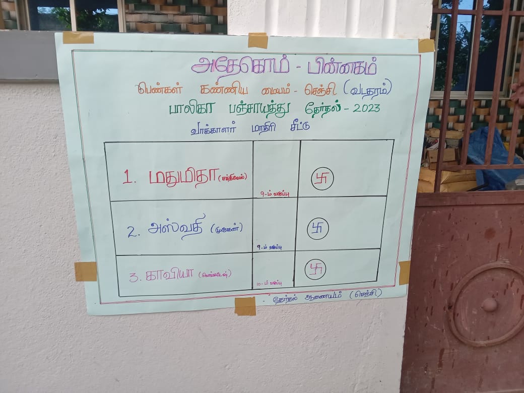 வருகின்ற ஞாயிறு அன்று மாலை வாக்கு எண்ணப்பட்டு வெற்றி பெற்றவர்களுக்கு ஊராட்சி மன்ற தலைவர் அவர்கள் பதவி பிரமாணம் செய்து வைக்க உள்ளார் .