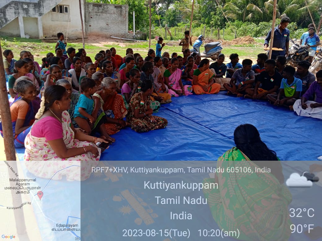On 15.08.2023, Our CBO’s, Youth members, Volunteers and staffs participated in Grama sabha in Villupuram, Thanjuvur, Thiruvanmalai , Karaikal, Chengalpatu, cuddalore , Kallakurchi and Pondicherry. In the Grama saba meeting they given request for Road facilities, library, canal and safety of women & children in villages. Our balavika panchyat members given request for village needs.