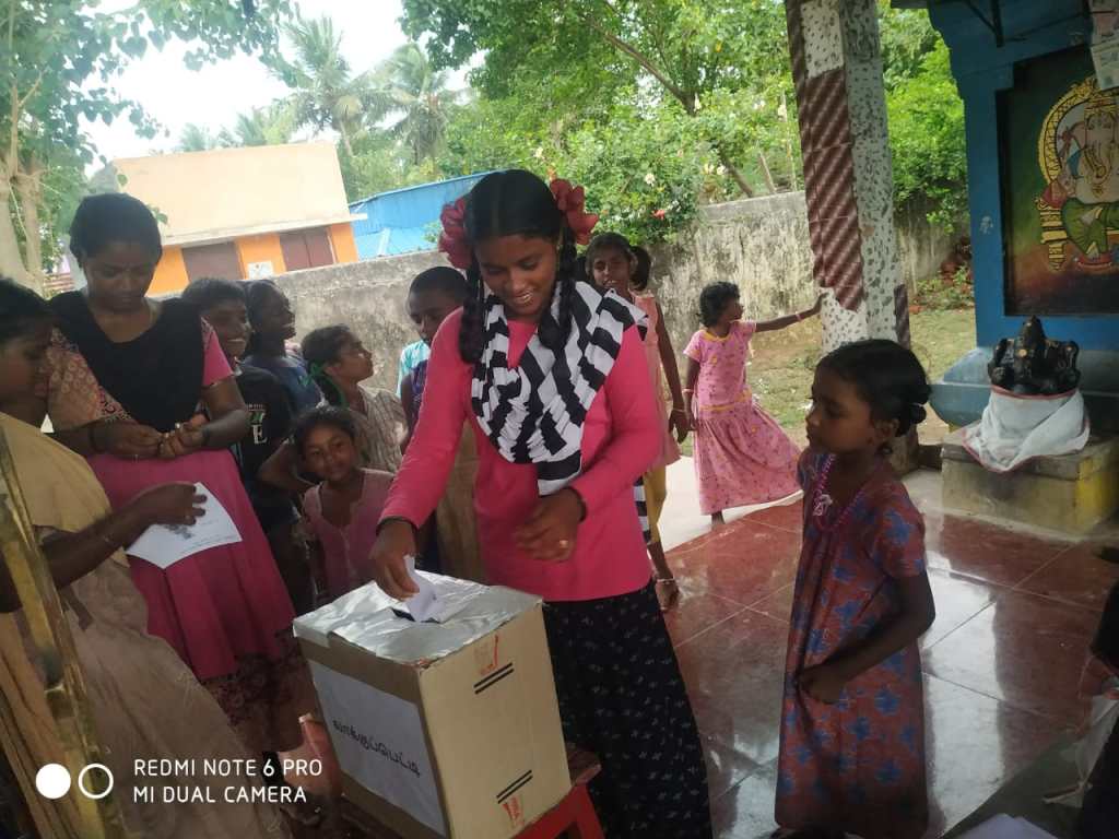 அவர் மாணவிகளிடம் இந்த சிறு வயதிலேயே உங்களுக்கு ஆளுமை திறனை வளர்ப்பதற்கு இந்த பாலிகா பஞ்சாயத்துவளர்ப்பதற்கு உறுதுணையாக இருக்கும் என்று கூறினார்.மாணவ மாணவிகளுக்கு வாழ்த்துக்களை தெரிவித்தார்.இத்தேர்தல் முடிந்தபின் வெற்றியாளர்களை என் தலைமையில் ஒரு விழாவாக வைத்து பதவியேற்க வைப்பேன் என்று கூறினார். சமூக குழு உறுப்பினர் திருமதி புஷ்பா மாணவர்களிடம் வாழ்த்துக்களையும் பாராட்டுகளையும் தெரிவித்துக்கொண்டு எங்களுடன் தேர்தல் முடியும் வரை இருந்து மாணவர்கள் கையில் மை இட்டார்.பின்னர் ஒவ்வொரு மாணவ மாணவிகளும் தங்கள் வாக்குகளை பதிவு செய்தனர்