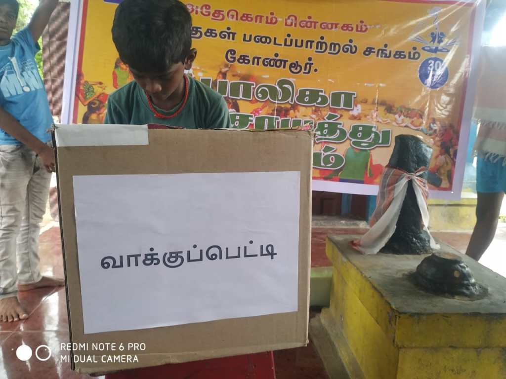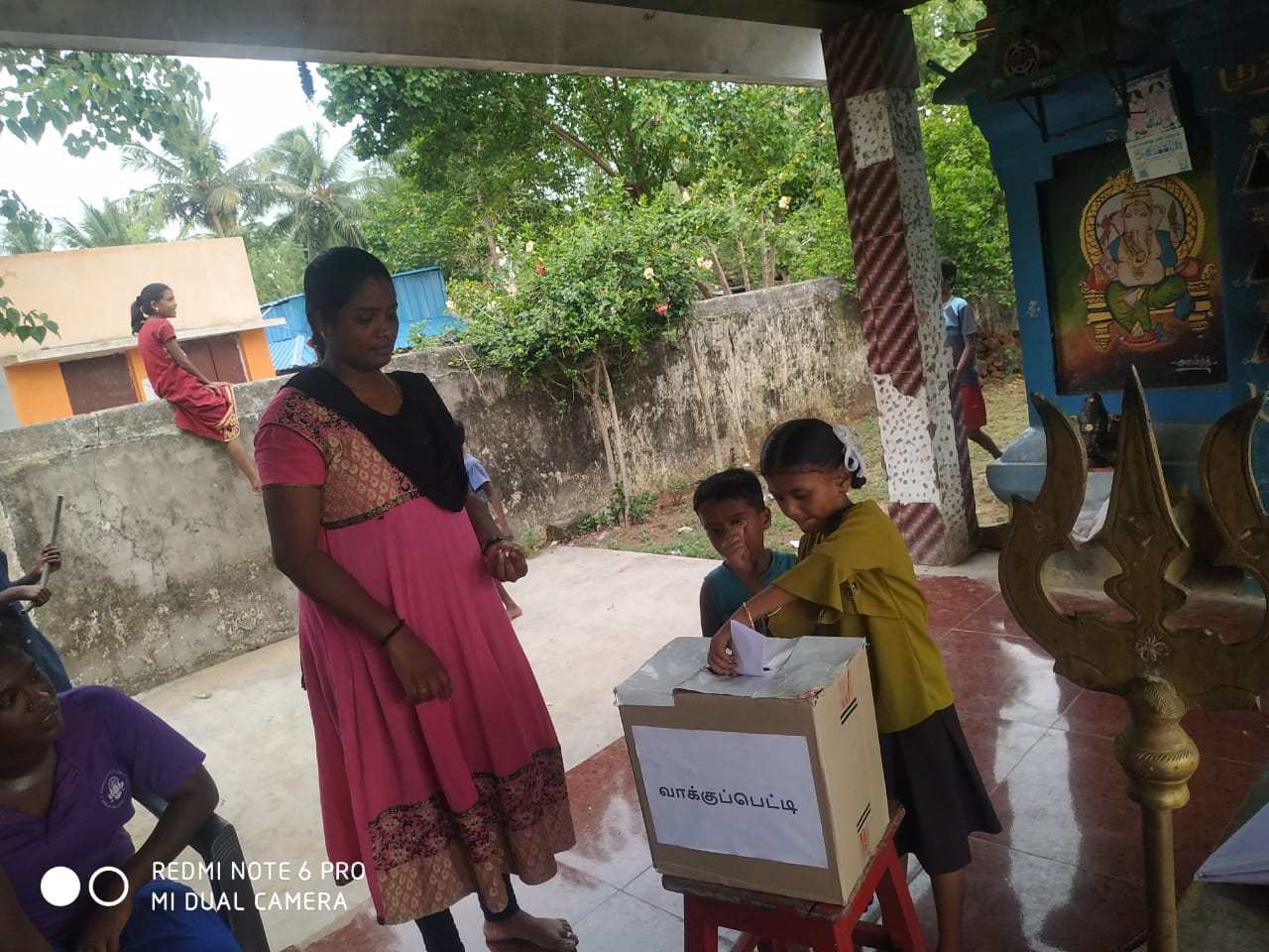 இந்த மூன்று வேட்பாளர்களும் தனித்தனியாக தங்களுக்கு வாக்குகள் பிரச்சாரம் செய்தனர்.பஞ்சாயத்து தலைவர் வருகை புரிந்து திரு ஏழுமலை சார் அவர்கள் வரவேற்று சால்வை அணிவித்தார்.மூன்று வேட்பாளர்களையும் அறிமுகப்படுத்தி வைத்தார்.திரு பஞ்சாயத்து தலைவர் அவர் மாணவ மாணவிகளிடம் பாலிகா பஞ்சாயத்தை பற்றி உரையாடினார்