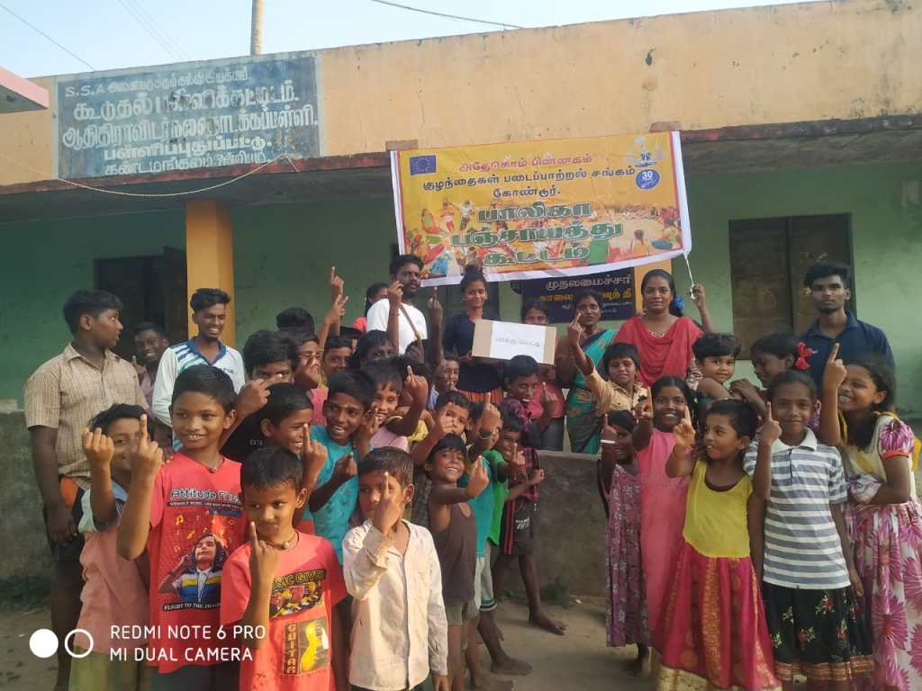 On 23.09.2023, Villipuram Women Resource center organized Baliga panchayat election held in Pallipudupeetu, Villupuram. In the election process, para legal Volunteers Mr.Arun & R,Sakhti were participated. In the election 60 children coasted their votes. Children enjoyed their election process.