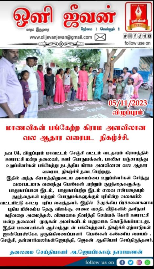 To Install a new electric post and street light. Provide road facilities. It was an event that made everyone understand the important problems of setting up individual toilets in homes and making them feel that it is an essential need. At the end of the program, a petition was written to Mr. Murugan, president of the Village Panchayat, requesting to solve the above problems quickly. After receiving the petition, the panchayat council president promised the members that he would complete the work quickly.