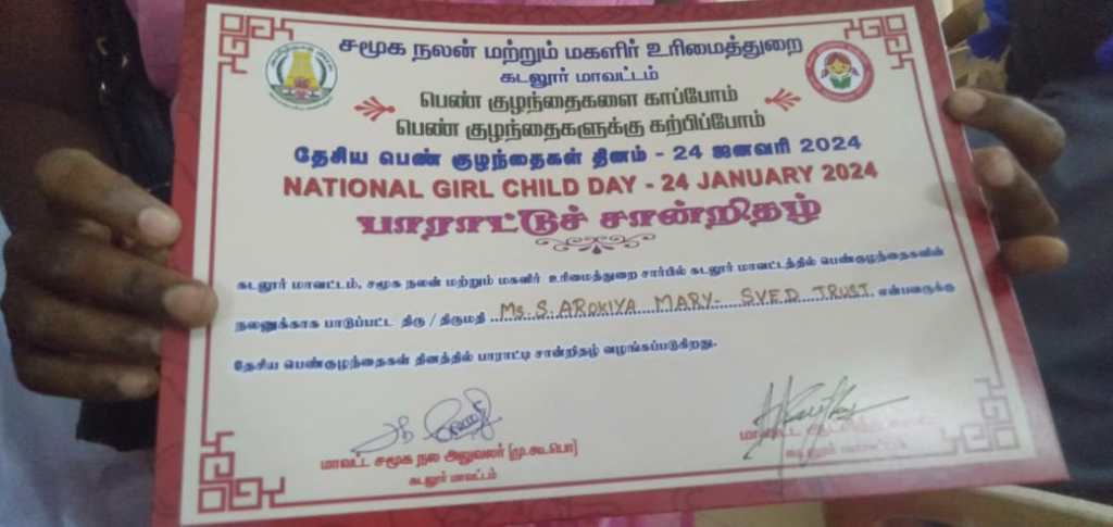 On the occasion of National Girl Child Day, on 24.01.2024 Social Welfare Department and Women Rights Department cordially, “National Girl Child Day Program” organized under the theme “Save the Girl Child, Teach the Girl Child” in Cuddalore district. In this program Mrs. Arokia Mary, Director of SVED and CBO or Partner Of ADECOM Network was commended and Awarded for her outstanding social work. Also Appreciation Certificate for Best Social Worker issued. Sharing her honorable moment through clicks.