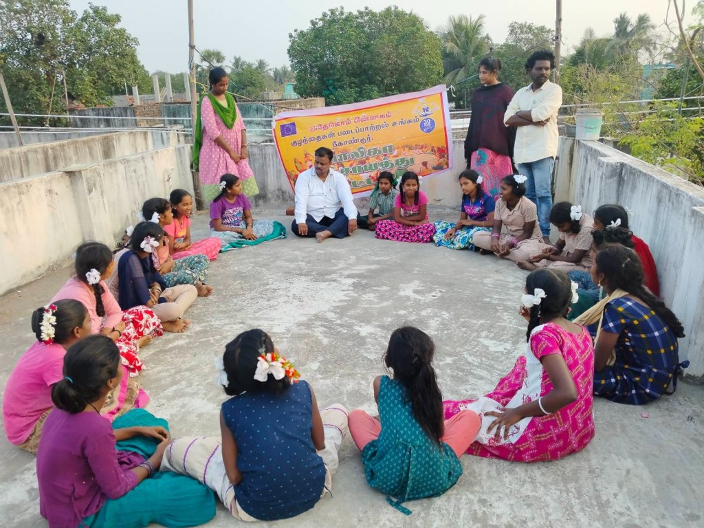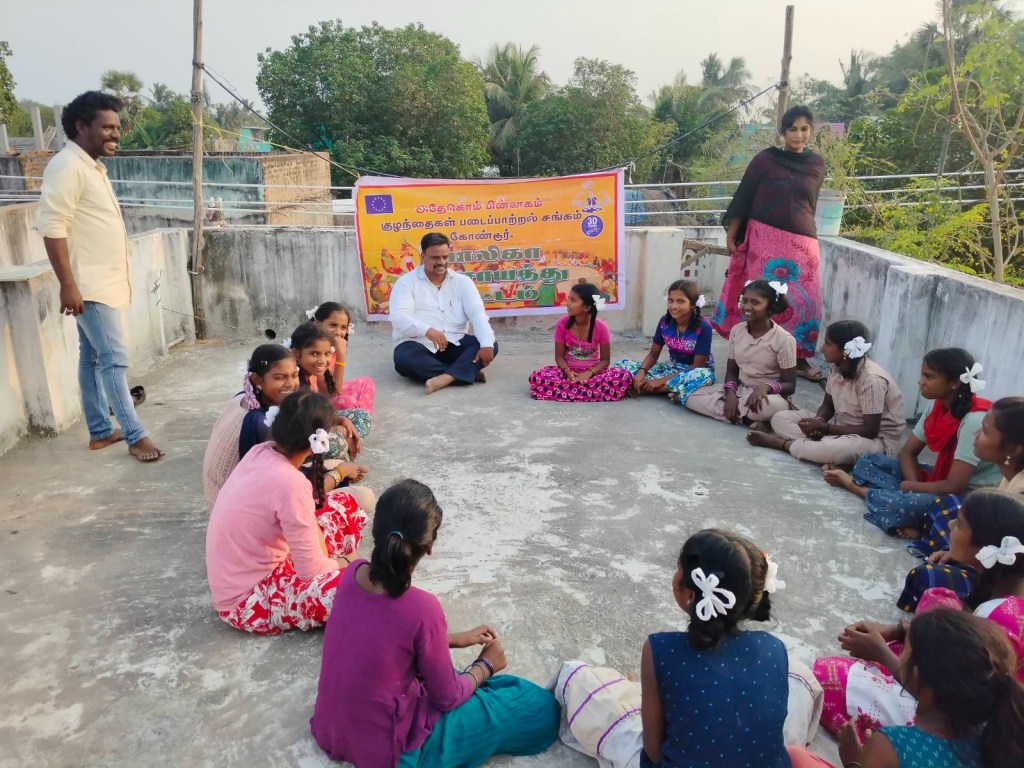On 23/02/2024 Balika Panchayat program, Navmal Marudhur was held at Dr. Ambedkar Nagar Ilandedi education teacher Preethi’s home. Around 14 children participated in this meeting and four children participated as spectators. CRC coordinator Thirumiku R. Jayaprabha organized this meeting by gathering all the children. She created awareness among the children about the safe and unsafe places in Villupuram district then the legal advisor Mr. Seenu Perumal lawyer suddenly joined as a special invitee which brought happiness among the children and they sat in a circle with the children and introduced themselves one by one. You are studying in school, the introduction started and all the children were happy. In this meeting, they said that at least five children will become collectors, five children will become policemen and four children will become doctors. Such comments were very interesting among the children. They said that we need toilet facility, we need road facility, we need a library, then Mr. Ezhumalai told him that we can help all of you to provide such facilities and your village gram panchayat head can petition them that the government has a plan for toilet facility and they should make arrangements for all the children on the ground to use it. He said that he will buy a mat for sitting and reading and I will deliver it myself by March 8th and he will give everyone a note-writing material. The meeting ended by motivational song by Mr.Ezhumalai.