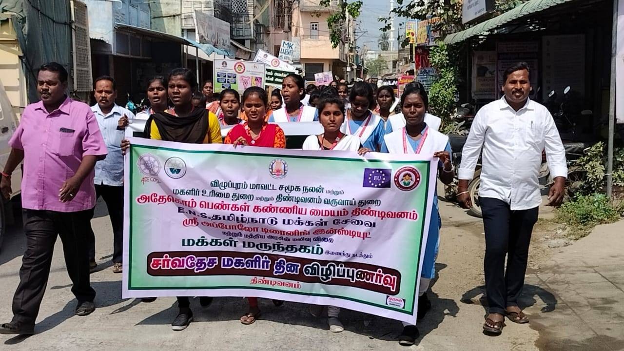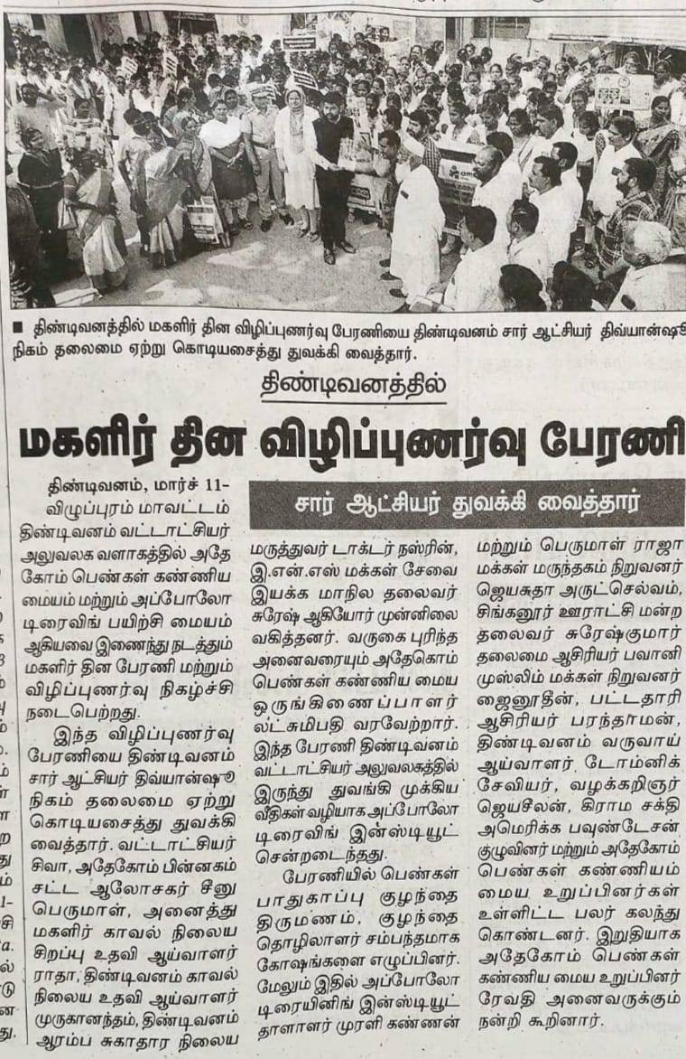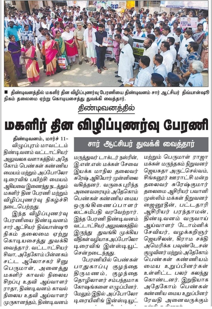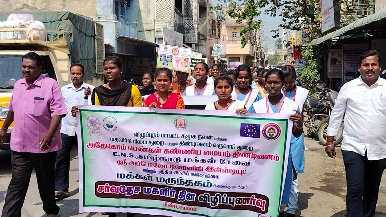 The District Social Welfare and Rights Department Office, Tindivanam organized an awareness rally and camp jointly organized by ADECOM Women’s Dignity Center and Apollo Driving Training Institute held at Tindivanam. This awareness rally was presided over by the Chief Collector of Tindivanam Divyan Shu Nigam by waving the flag along with Mr. Vattakshiar Siva ENS State Head Suresh, All Women Police Station Special Assistant Inspector Mrs. Radha, Tindivanam Police Station Assistant Inspector Muruganantham Tindivanam Primary Health Center Doctor Dr. Nasrin All the leaders were welcomed by the coordinator of ADECOM Women’s Dignity Center, Mr. Lakshmipathi. The rally started from Tindivanam District Collector’s Office and reached Apollo Driving Institute through the main roads where women’s protection, child marriage and child labor sllogans were raised. The director of Apollo Training Institute. Murali Kannan and Perumalraja, People’s Dispensary Founder Mrs. Jayasuda Arutselvam Singanur Panchayat Council President Suresh Kumar Head Teacher Bhavani Muslim People Founder Jayinuth Social Welfare Officers Amsaveni. Art Graduate Teacher Paranthaman Tindivanam Revenue Inspector Dominique Xavier Advocate Jayaseelan. And Revathy, a member of the Women’s Dignity Centre, And finally a pledge was taken regarding women’s safety and child marriage. Similarly, an awareness camp was held in our school once a month and now child marriage, drug eradication is decreasing in our area and I would like to express my gratitude to this team on behalf of our school. Two female students spoke about the progress made by women in the college student community. Concluded by wishing everyone a Happy Women’s Day.