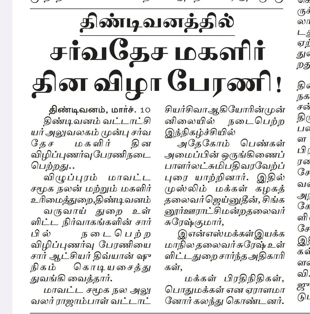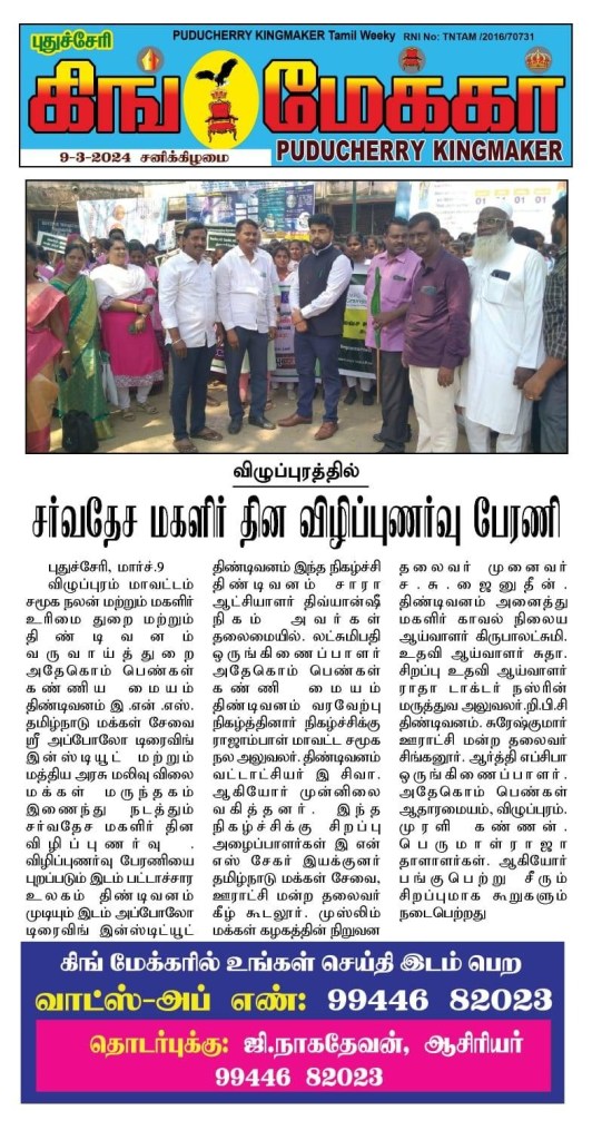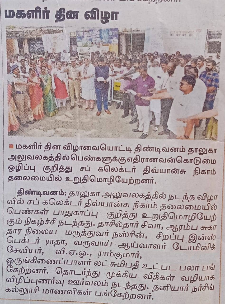 The District Social Welfare and Rights Department Office, Tindivanam organized an awareness rally and camp jointly organized by ADECOM Women’s Dignity Center and Apollo Driving Training Institute held at Tindivanam. This awareness rally was presided over by the Chief Collector of Tindivanam Divyan Shu Nigam by waving the flag along with Mr. Vattakshiar Siva ENS State Head Suresh, All Women Police Station Special Assistant Inspector Mrs. Radha, Tindivanam Police Station Assistant Inspector Muruganantham Tindivanam Primary Health Center Doctor Dr. Nasrin All the leaders were welcomed by the coordinator of ADECOM Women’s Dignity Center, Mr. Lakshmipathi. The rally started from Tindivanam District Collector’s Office and reached Apollo Driving Institute through the main roads where women’s protection, child marriage and child labor sllogans were raised. The director of Apollo Training Institute. Murali Kannan and Perumalraja, People’s Dispensary Founder Mrs. Jayasuda Arutselvam Singanur Panchayat Council President Suresh Kumar Head Teacher Bhavani Muslim People Founder Jayinuth Social Welfare Officers Amsaveni. Art Graduate Teacher Paranthaman Tindivanam Revenue Inspector Dominique Xavier Advocate Jayaseelan. And Revathy, a member of the Women’s Dignity Centre, And finally a pledge was taken regarding women’s safety and child marriage. Similarly, an awareness camp was held in our school once a month and now child marriage, drug eradication is decreasing in our area and I would like to express my gratitude to this team on behalf of our school. Two female students spoke about the progress made by women in the college student community. Concluded by wishing everyone a Happy Women’s Day.