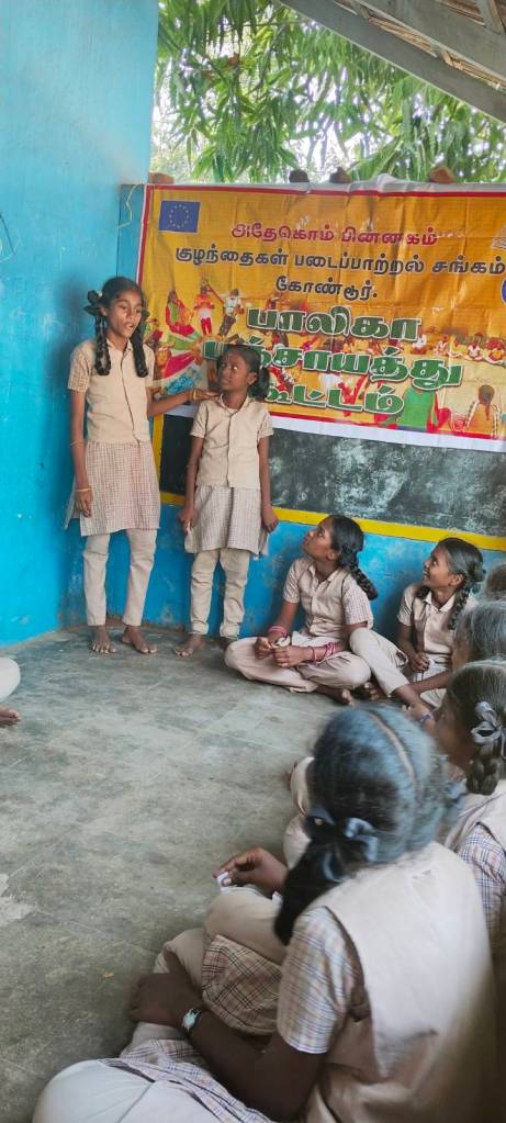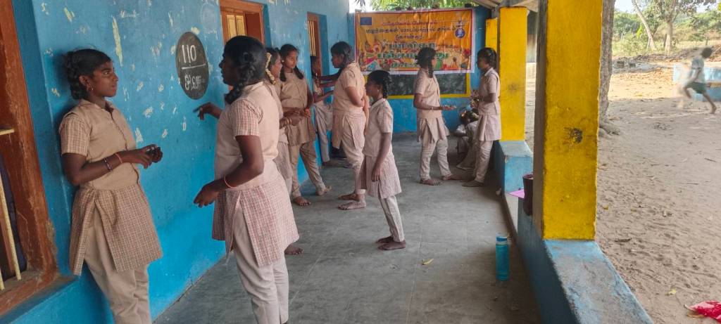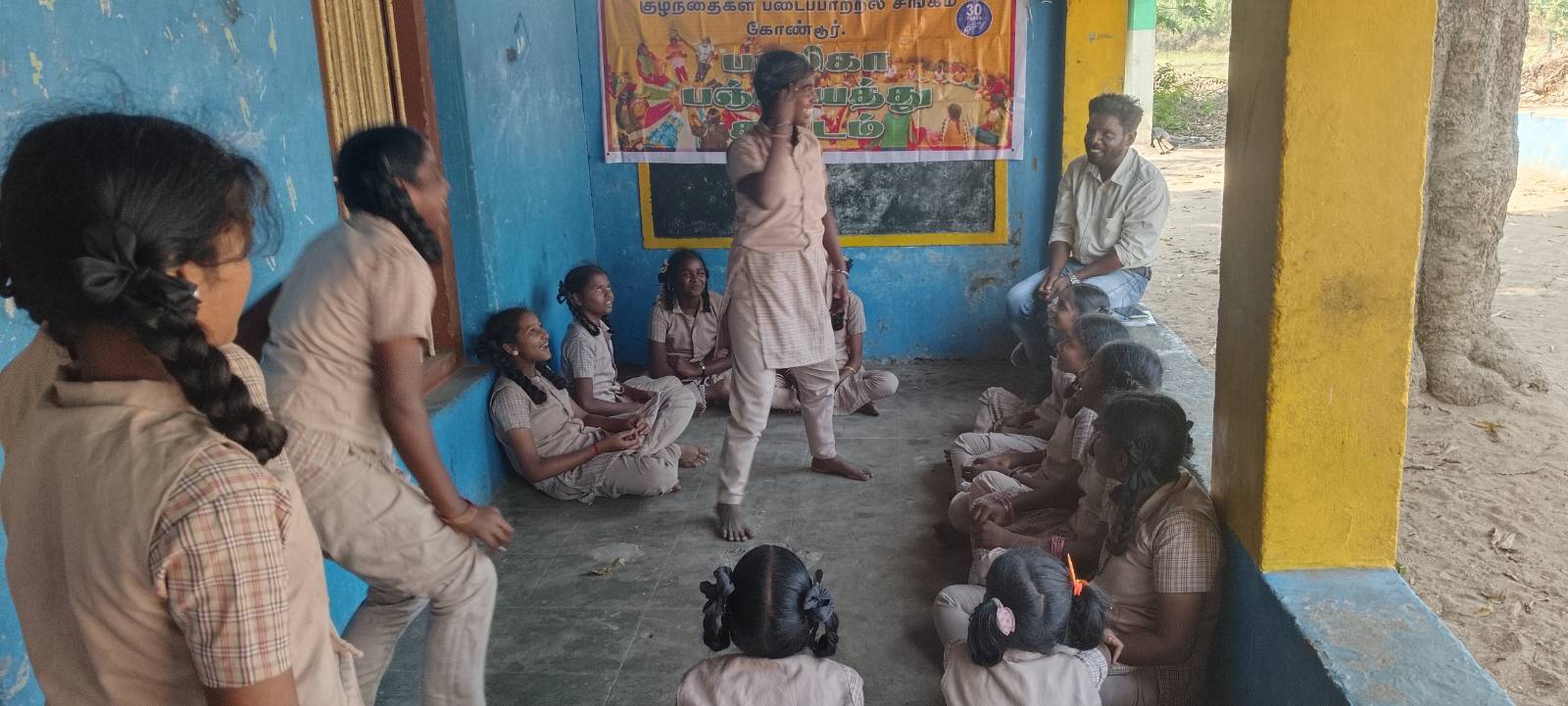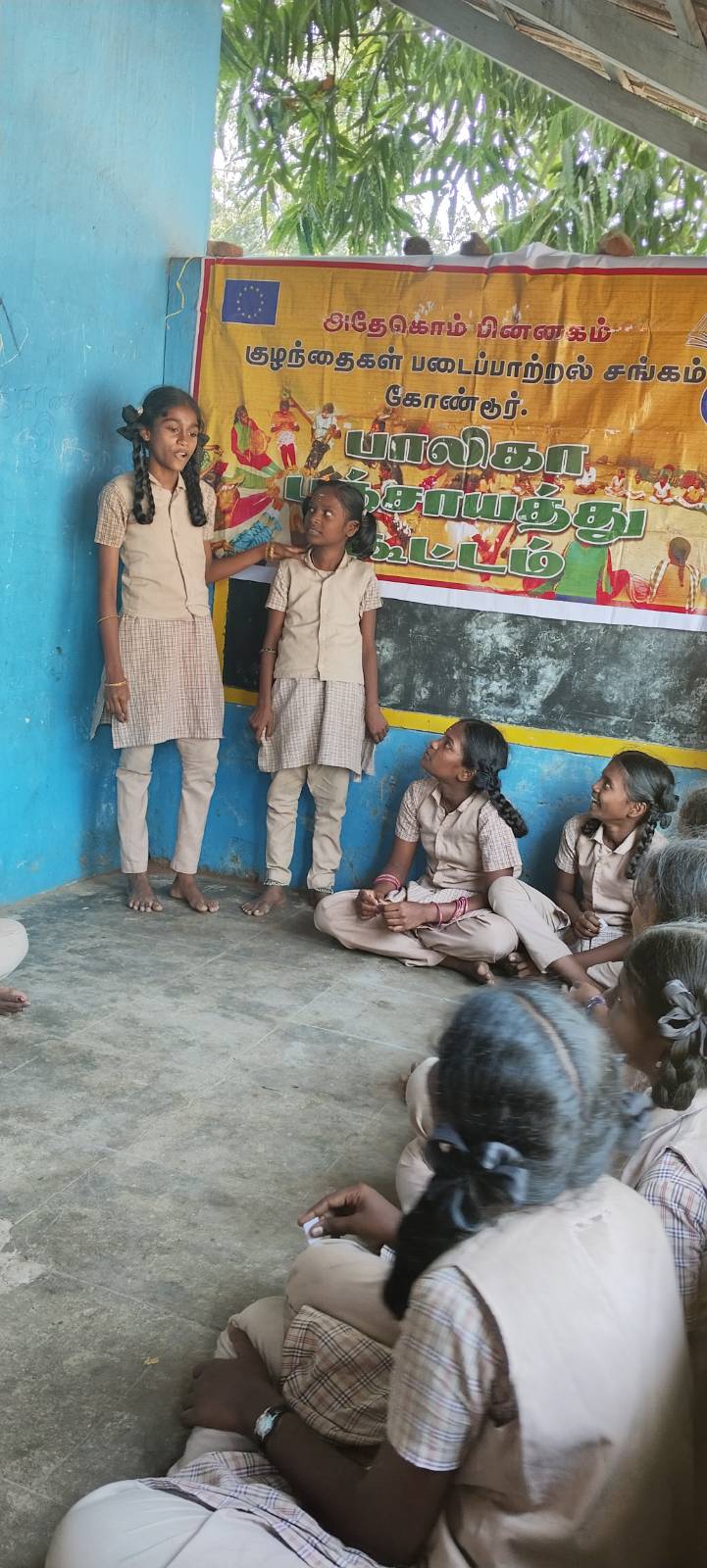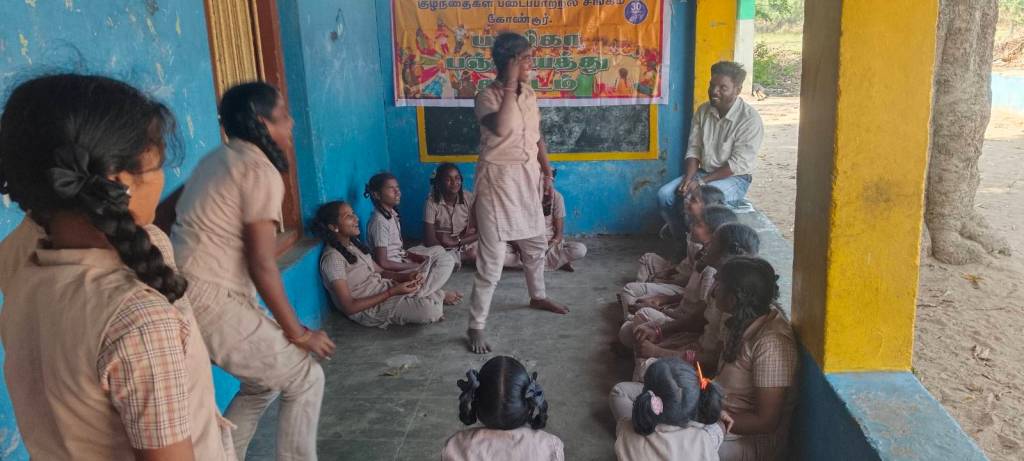 முதலில் அனைத்து மாணவிகளின் வட்டமாக அமர வைத்து கைகளை தட்டி மகிழ்விக்கிறோம். பிறகு கூட்டத்தில் லிவிஷ்டியா என்ற மாணவியை பாடல் ஒன்றை பாடும் படி கூறினோம். அது அவரும் நாட்டுப்புறப் பாடல் அழகாக பாடினார் அனைவரும் கண்டு மகிழ்ந்தனர்
