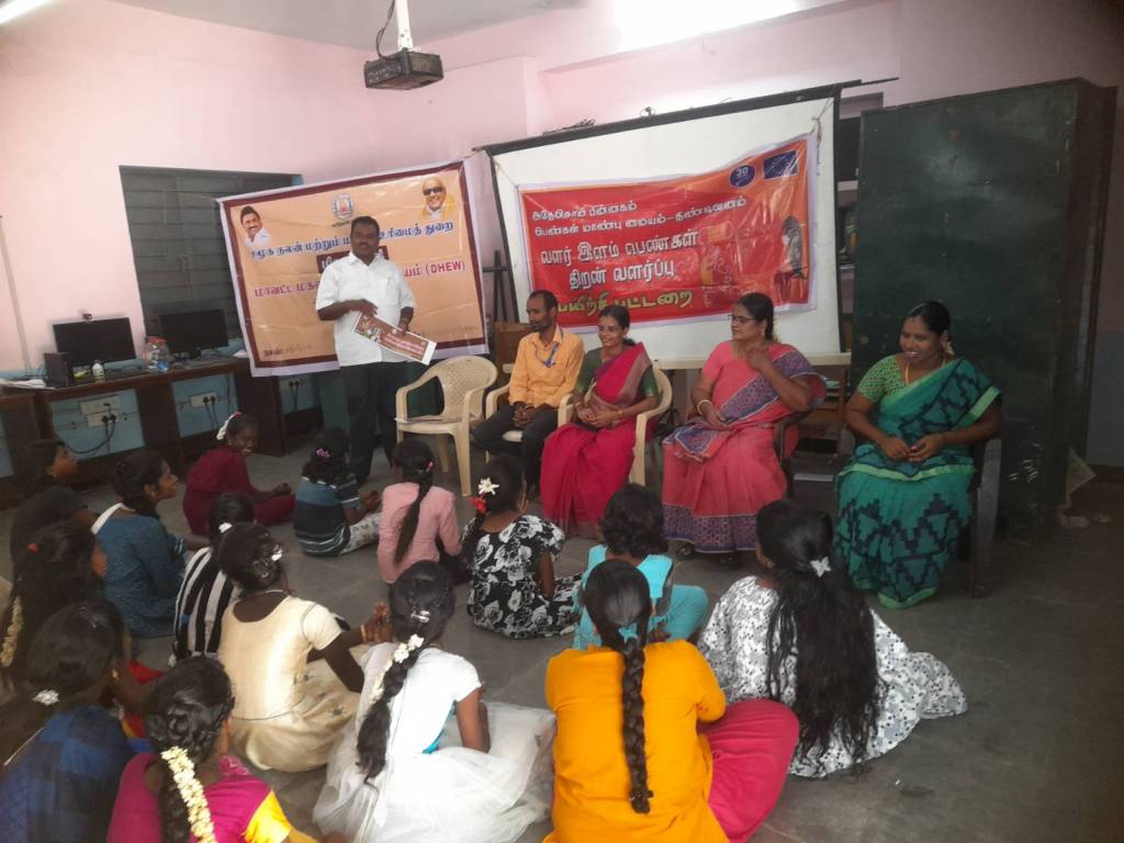 A Capacity Building training for Adolescent Girls was held on behalf of ADECOM Women’s Dignity Center. Facilitator Mr.Lakshmipathi welcomed them all at the beginning of the training. Villupuram District Social Welfare and Rights Department is the special invitee for this training. Ms. Gejalakshmi, District Coordinator of Women’s Hub Centre participated as the special guest and gave a speech to the students about the need for protection of girl children. The need for education for girls and the welfare programs of the government for women. Also in the training, he told the children about violence against women and rights for women and how we can prepare ourselves at this age about the psychological changes that occur during growth. Ms. Bhavani, the school principal of Government high School Kollar, said that all the children should continue their studies in a good manner. Educational guidance was also explained to the children who are passing 10th. 27 children participated in this exercise and shared their views and benefited. In the next step, the Kollar school teacher Ms. Samyukta explained in this exercise about cleanliness and hygiene for the benefit of the children. WDC Facilitator Mr. Lakshmipathi spoke about the effects of child marriage. Finally, Ms. Revathi gave a vote of thanks to all.